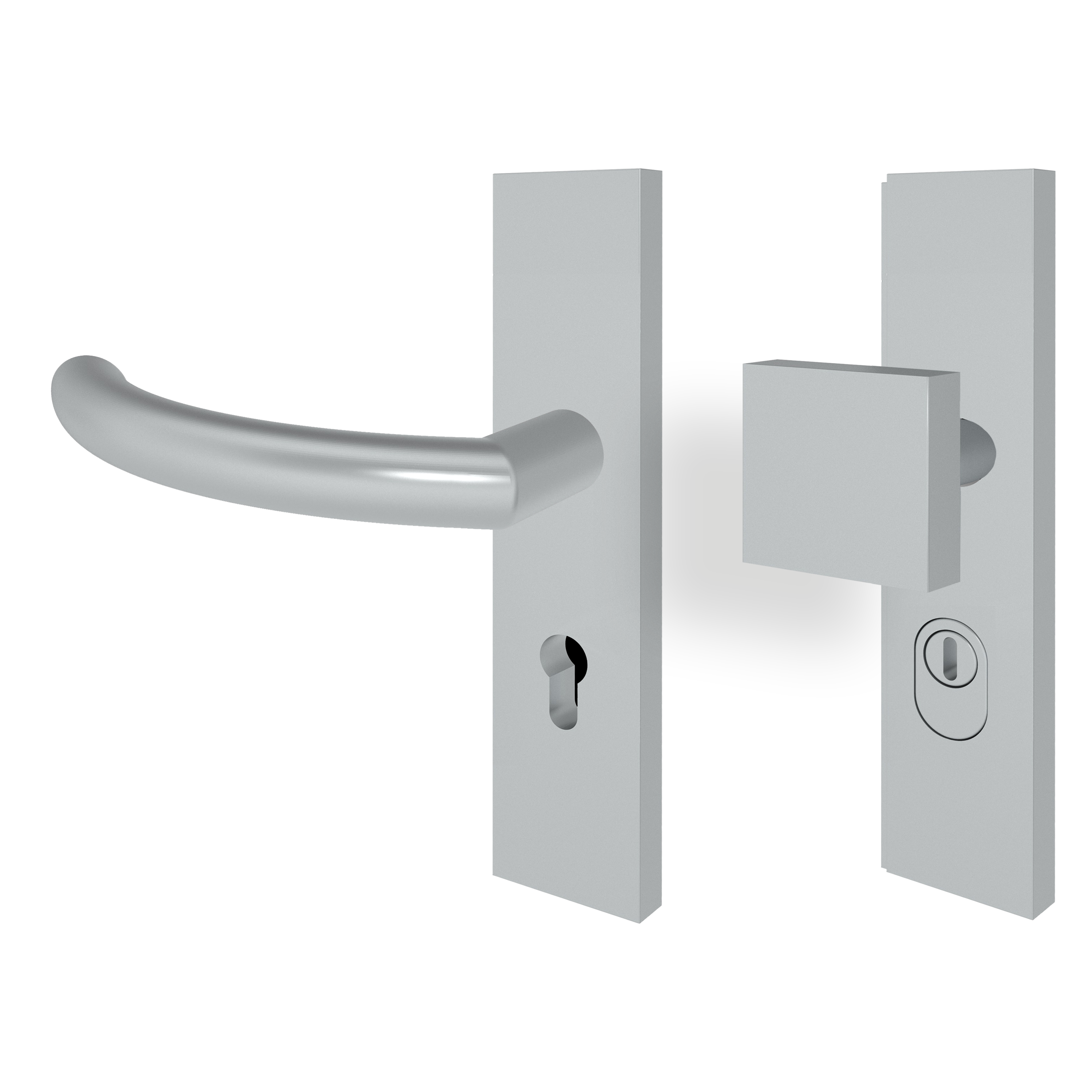 L wie Langeoog und leichtgebogene L-Form. Durch diese besondere Formgebung bietet dieser Türgriff zusätzlichen Griffhalt. Die Oberfläche ist aufgrund des matt gebürsteten Edelstahls leicht griffig, besonders robust und sorgt dafür, dass kaum Abdrücke hinterlassen werden. Die Schutzgarnitur mit einem massiven eckigen Langschild verfügt über einen einseitigen Türknauf mit Kernziehschutz sowie einem Lochteil, das um den Drücker ergänzt wird. Geprüft nach DIN 18257-ES1 und DIN EN1906-EN2.
