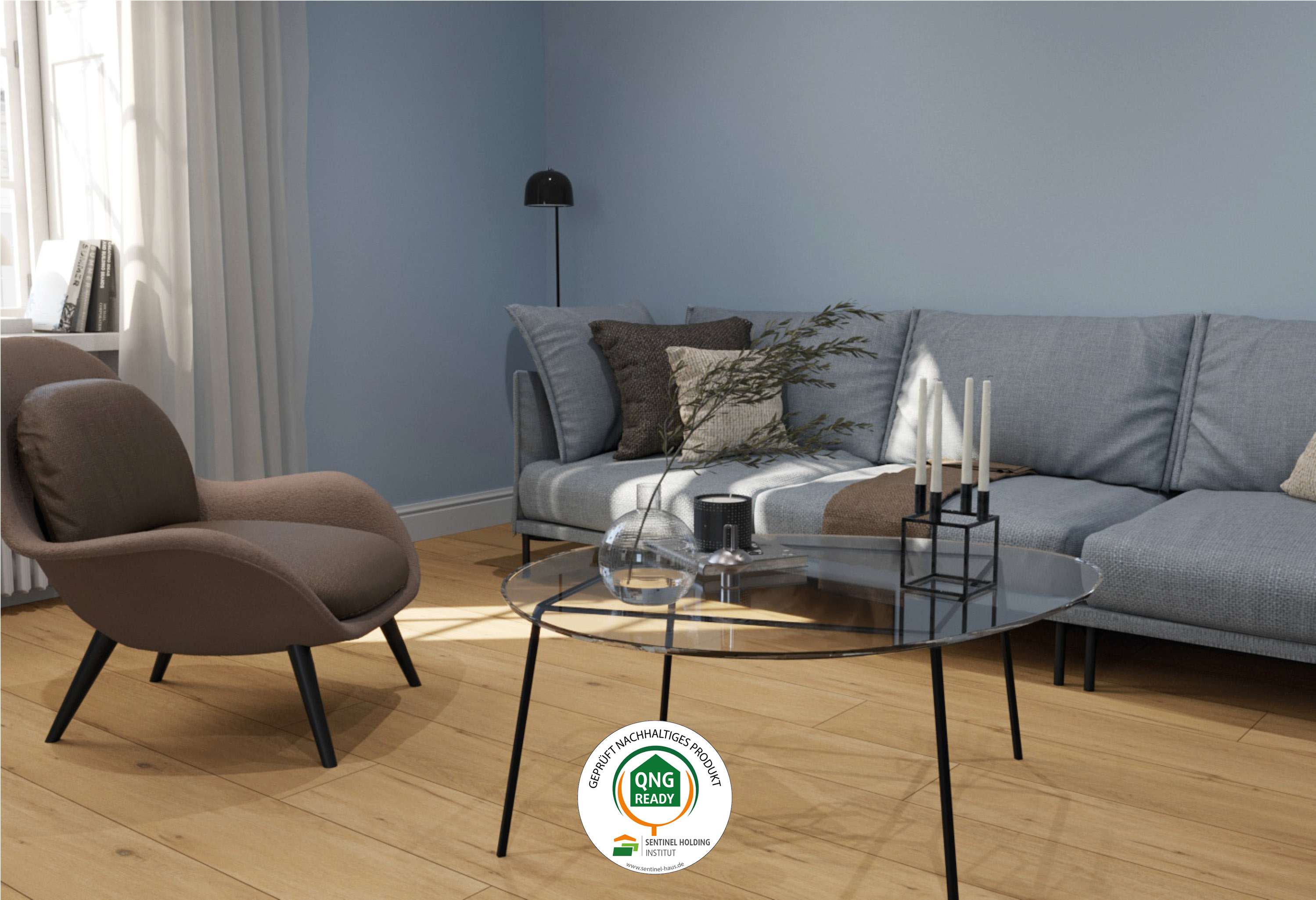 Gekonnter Auftritt. Die warmen Farben der Eiche, vereint mit sichtbaren Ästen und Rissen, erzeugen bei unserem Designboden Porto (DB21002) einen natürlichen Look. Ein Design, das sich mühelos in jede Wohnlandschaft integrieren lässt und zahlreiche Möglichkeiten für individuelle Kombinationen bietet. Die Landhausdiele XL mit den Abmessungen 1524 x 228 mm verfügt über eine lackierte V-Fase, die den typischen Dielencharakter bewusst betont. Dank der Synchronprägung entsteht ein Boden höchster Authentizität, der von echtem Holz kaum zu unterscheiden ist. Die integrierte 1mm IXPE Trittschalldämmung ermöglicht eine einfache und schnelle Verlegung ohne zusätzliche Dämmunterlage. Mit der 0,55 mm Nutzschicht ist der Boden sowohl für die private als auch für die gewerbliche Nutzung geeignet.