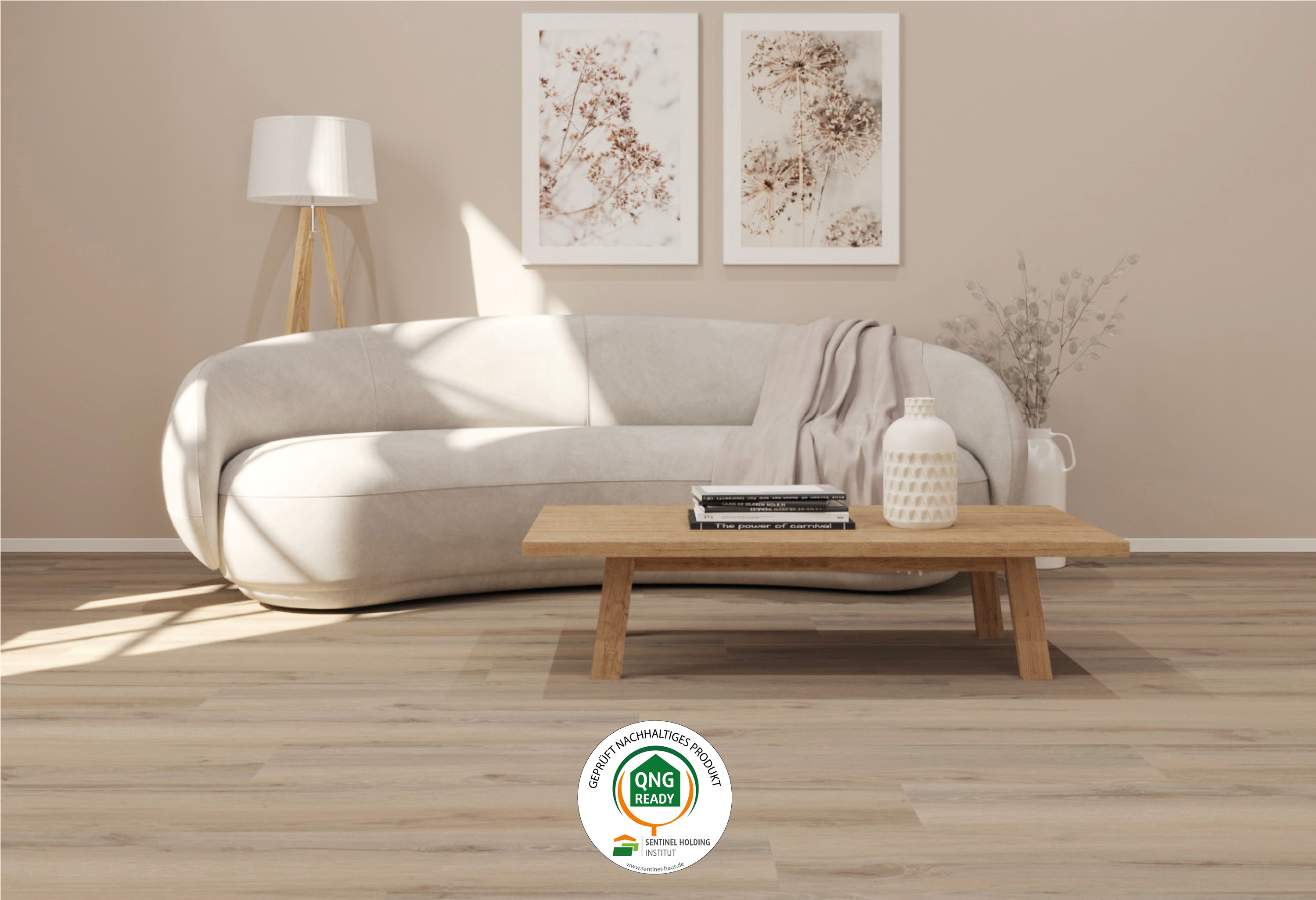 Ruhige Lebensfreude. Die Verbindung von hellem Beige und dem leicht markanten Holzbild schafft bei dem Designboden Santana (DB21013) eine zeitlose Ästhetik, die den Raum mit Wärme und Gelassenheit erfüllt. Vielfältige Kombinationsmöglichkeiten erlauben es, die Landhausdiele im Format 1200 x 228 mm harmonisch in unterschiedliche Einrichtungsstile zu integrieren – auch dank der dezenten Microfase. Aufgrund der integrierten Trittschalldämmung werden zusätzliche Dämmunterlagen nicht benötigt und der Boden kann direkt verlegt werden.
