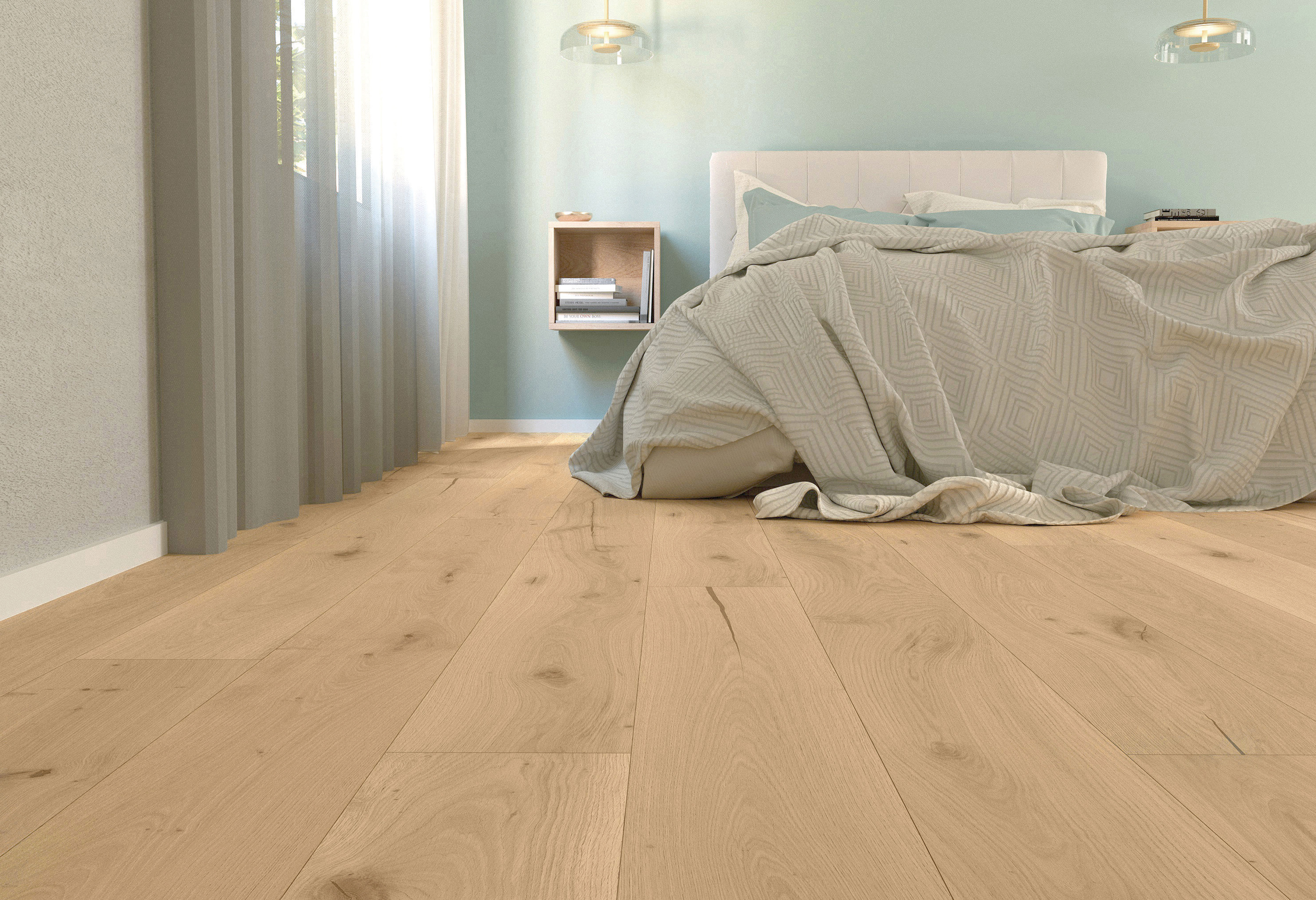 Reinste Natur. In einem hellen Beige, das die sanften Nuancen des Sandes einfängt, erzeugt der Parkettboden Carnavon (PB60004) eine zeitlose Atmosphäre, die vielfältige Möglichkeiten für die Raumgestaltung eröffnet. Durch die unsichtbare Ölung wird die natürliche Schönheit der markanten Eiche betont und eine Gesamtwirkung von höchster Natürlichkeit kreiert. Der Boden im Format 1900 x 190 mm verfügt über Astansätze und Risse, die nur dezent betont werden und weniger kontrastreich sind.