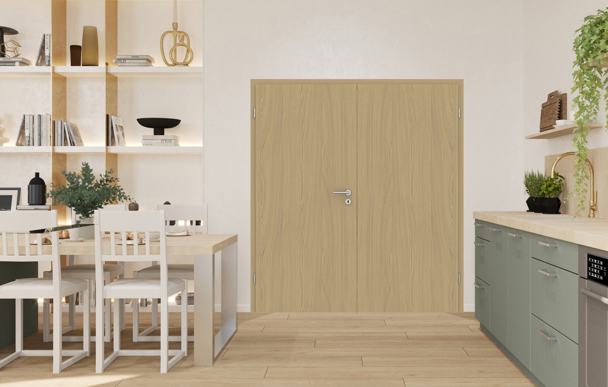 Optischer Effekt: Unsere Innentür CPL Mattline Eiche Naturbeige vereint ein warmes Beige mit dezenten Eichestrukturen. Das Design mit Designkante integriert sich wunderbar in moderne Wohnlandschaften und schafft eine gemütliche Atmosphäre. Helle Wandfarben wie Weiß oder ein gleichfarbiges Beige sorgen für den richtigen Auftritt. Dank einer besonderen Oberflächenbehandlung erzeugt die Holzstruktur je nach Lichteinfall eine unterschiedlich intensive Optik. Aufgrund der CPL-Beschichtung ist die Oberfläche zudem besonders robust, langlebig und pflegeleicht. Als Doppeltür ist sie nicht nur ein besonderes Gestaltungselement, sondern sorgt auch für einen großen Auftritt. Bestehend aus einem Stand- sowie Gehflügel verbindet sie Räume elegant miteinander, ist gleichzeitig aber auch ein praktischer Raumtrenner. Angeboten wird sie als Element mit farblich passender Zarge.