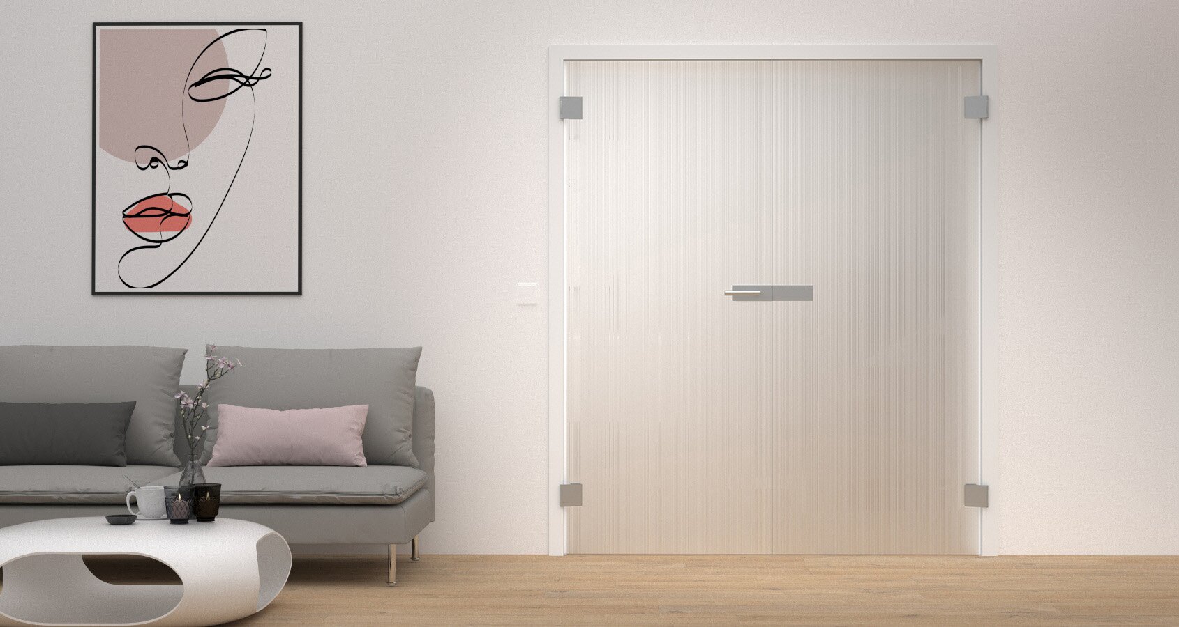 Die Magie der Dimensionen: Kleinste Sandkörner zeichnen mit einem leichten Druck auffällige Motive in die Glasoberfläche. Durch die beidseitig versetzt angeordneten Motive entsteht ein 3D-Effekt, der für eine ganz besondere lebendige Wirkung im Raum sorgt. Die zusätzliche Nano-Oberfläche schützt die Ganzglastür außerdem vor Schmutz und Abrieb. Als Doppeltür sind sie ein besonderes Gestaltungselement mit großer Wirkung. Bestehend aus einem Stand- sowie Geflügel verbinden sie Räume elegant miteinander, sind gleichzeitig aber auch ein praktischer Raumtrenner.