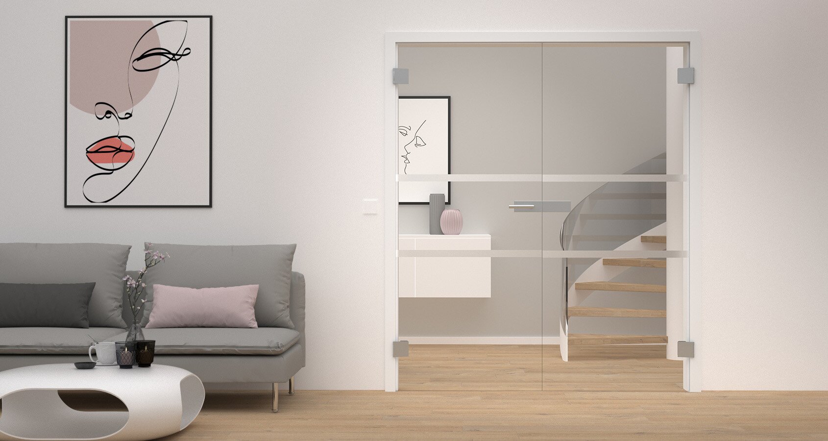 Sandiose Transparenz: Die sanften Sandstrahlungen setzen ansprechende Akzente, nehmen der Ganzglastür aber dennoch nicht ihre überzeugenden Eigenschaften wie räumliche Helligkeit und ein offenes Wohngefühl. Die mattierten Glasflächen in verschiedenen modernen Motiven sorgen gleichzeitig aber auch für ein Stück Privatsphäre. Optimal zum Beispiel für das Badezimmer oder in Besprechungsräumen. Als Doppeltür sind sie ein besonderes Gestaltungselement mit großer Wirkung. Bestehend aus einem Stand- sowie Geflügel verbinden sie Räume elegant miteinander, sind gleichzeitig aber auch ein praktischer Raumtrenner.
