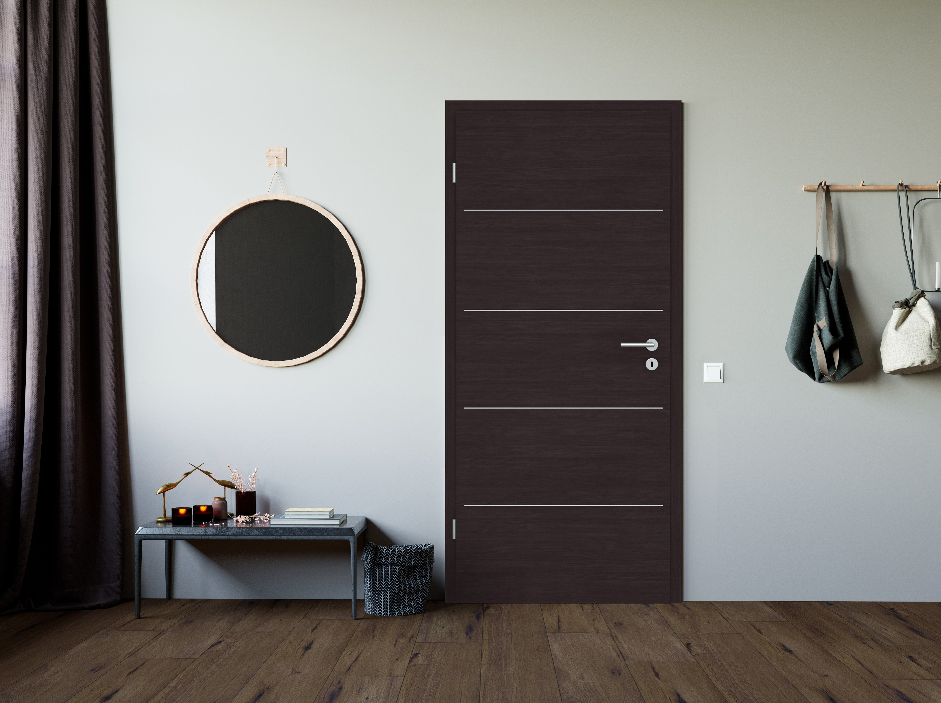 Colour meets Holzdesign: Durch die dezente Holzstruktur in Kombination mit dem modernen Farbton Graphitgrau überzeugt die CPL Mattline-Oberfläche nicht nur optisch, sondern schafft auch ein haptisches Erlebnis mit einem besonderen Matt-feeling. Bei der Queroptik erscheint die die Oberflächenstruktur je nach Lichteinfall noch etwas intensiver. Das dunkle Braun-Grau wirkt sehr charakterstark und lässt sich besonders gut mit weißen Wandfarben kombinieren. Das Türblatt verfügt über eine Designkante, die mit ihrem minimalen Kantenradius eine sehr moderne Optik erzeugt. Die Oberfläche aus CPL macht die Tür zudem besonders robust und langlebig. Passend zur Tür führen wir auch Zargen CPL Mattline Graphitgrau im Sortiment. Flächenbündige Lisenen im klassischen Edelstahl oder modernen Mattschwarz erzeugen besondere Akzente. Eine Auswahl an verschiedenen Designs sorgen für die perfekte Abstimmung auf den Wohn- und Einrichtungsstil.