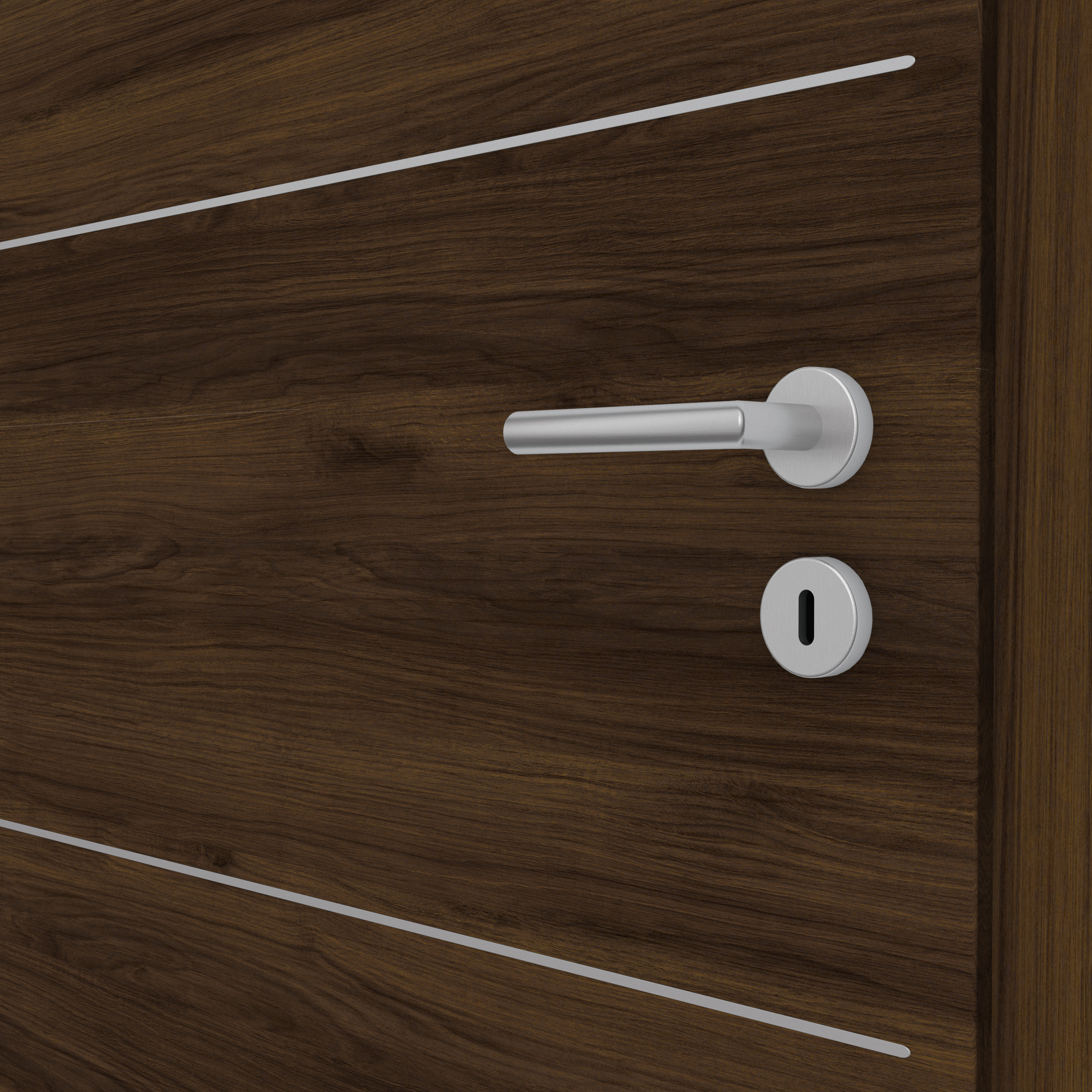 Hochwertige Metallveredelungen: Unsere Innentür CPL Mattline Nussbraun quer vereint ein warmes Braun mit dezenten Holzstrukturen. Das markante Design mit moderner Designkante strahlt besonders viel Wärme und Gemütlichkeit aus. Vor allem weiße Wandfarben und eine helle Einrichtung lenken den Fokus auf die Tür und sorgen für angenehme Kontraste. Dank einer besonderen Oberflächenbehandlung erzeugt die Holzstruktur je nach Lichteinfall eine unterschiedlich intensive Optik. Bei der Querstruktur kann diese sogar noch deutlicher sichtbar sein. Aufgrund der CPL-Beschichtung ist die Oberfläche zudem besonders robust, langlebig und pflegeleicht. Flächenbündige Lisenen im klassischen Edelstahl oder modernen Mattschwarz erzeugen besondere Akzente. Eine Auswahl an verschiedenen Designs sorgen für die perfekte Abstimmung auf den Wohn- und Einrichtungsstil.