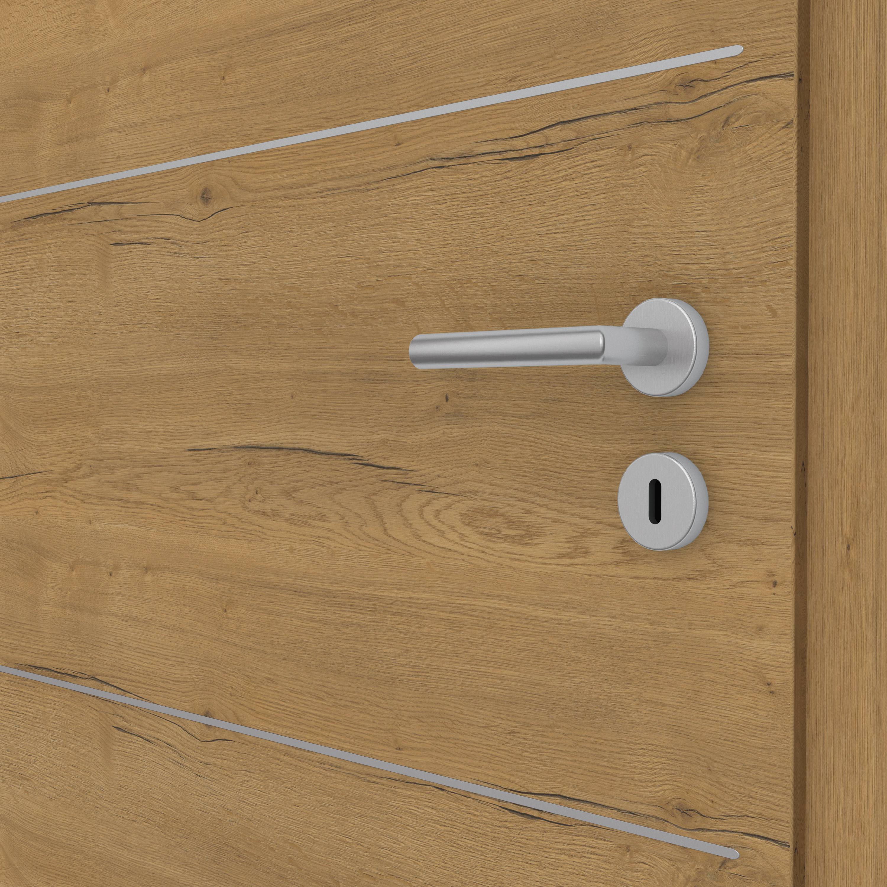 Wie echtes Holz: Das Dekor Fachwerk Eiche Honig quer steht für höchste Authentizität und ist dank der fühlbaren Holzstruktur in Queroptik kaum von einer Echtholzoberfläche zu unterscheiden. Der warme Braunton mit einer auffälligen Holzmaserung steht für pure Natürlichkeit und sorgt für eine behagliche Raumatmosphäre. Das Türblatt verfügt über eine Designkante, die mit ihrem minimalen Kantenradius eine sehr moderne Optik erzeugt. Die Oberfläche aus CPL macht die Tür zudem besonders robust und langlebig. Passend zur Tür führen wir auch Zargen Fachwerk Eiche Honig im Sortiment. Wir empfehlen hierzu unsere Fußleisten Design in Weiß 9003 oder 9010 – passend zur Wandfarbe und den Eichrichtungselementen. Flächenbündige Lisenen im klassischen Edelstahl oder modernen Mattschwarz erzeugen besondere Akzente. Eine Auswahl an verschiedenen Designs sorgen für die perfekte Abstimmung auf den Wohn- und Einrichtungsstil.