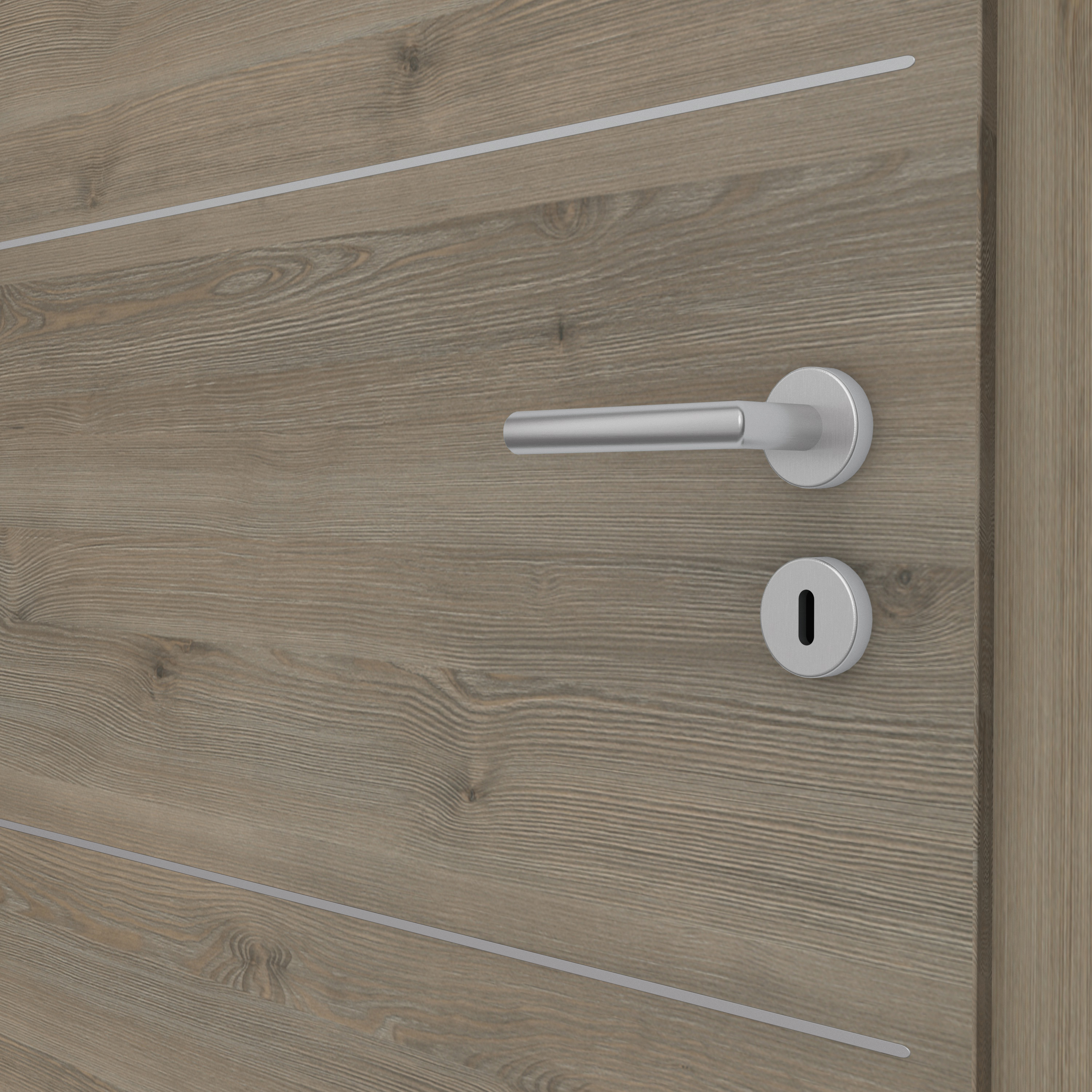 Wie echtes Holz: Die Pinie ist eine italienische Kiefernart und hat ihren Ursprung im nördlichen Mittelmeer. Unser Dekor Pinie Silvergrey quer überzeugt durch einen Farbton in Grau-Braun mit dezenten Astspuren. Das leicht dunkle Design mit spürbarer Holzstruktur in Längsoptik ist sehr ausdrucksstark und lässt sich optimal mit weißen Wandfarben kombinieren. Das Türblatt verfügt über eine Designkante, die mit ihrem minimalen Kantenradius eine sehr moderne Optik erzeugt. Die Oberfläche aus CPL macht die Tür zudem besonders robust und langlebig. Passend zur Tür führen wir auch Zargen Pinie Silbergrau im Sortiment. Wir empfehlen hierzu unsere Fußleisten Design in Weiß 9003 oder 9010 – passend zur Wandfarbe und den Eichrichtungselementen.