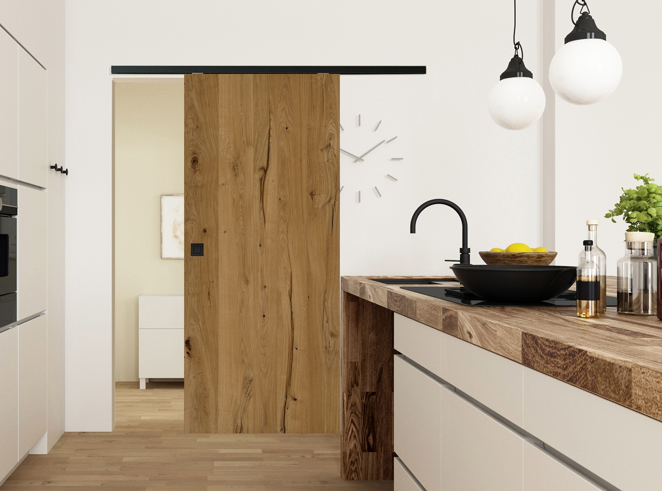 Charakterstarke Natur: Unsere Echtholztür Furnier Antik Eiche Natur überzeugt mit markanten Astlöchern und Rissen, welche mit einem schwarzen Vlies hinterlegt sind. Dadurch entsteht eine einzigartige Optik und Haptik, wie sie aus der freien Natur bekannt ist. Die vertikale Zusammensetzung der Eichenfurniere erzeugt eine wildwüchsige und außergewöhnliche Längsoptik - mehr Natürlichkeit geht kaum. Die natürliche Optik mit einem hellen Farbspiel in Braun-Beige macht diese Innentür zu einem charakterstarken Unikat und zu einem Highlight in jedem Wohnraum. Die Mattlackierung erzeugt zudem eine sehr moderne Wirkung. Als Schiebetür bietet sie nicht nur einen hohen Raumkomfort, sondern ist auch eine platzsparende Lösung. Hierfür stehen verschiedenen Schiebetürsysteme zur Auswahl. Passend zur Tür führen wir auch Schiebetürzargen in Eiche Natur im Sortiment.