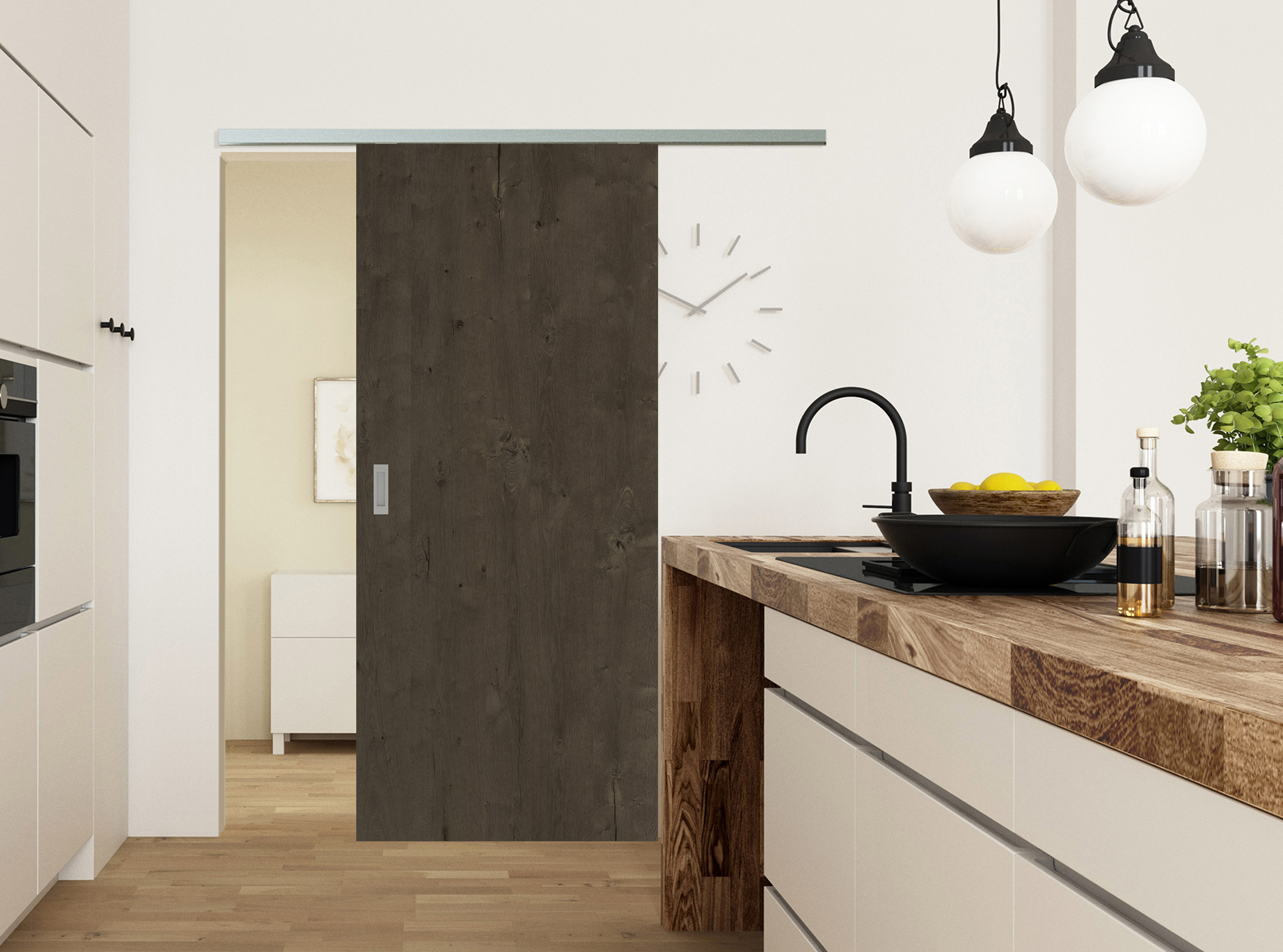 Charakterstarke Natur: Unsere Echtholztür Furnier Antik Eiche Titan überzeugt mit markanten Astlöchern und Rissen, welche mit einem schwarzen Vlies hinterlegt sind. Dadurch entsteht eine einzigartige Optik und Haptik, wie sie aus der freien Natur bekannt ist. Die vertikale Zusammensetzung der Eichenfurniere erzeugt eine wildwüchsige und außergewöhnliche Längsoptik - mehr Natürlichkeit geht kaum. Das daraus resultierende lebhafte Farbspiel in leicht kühlen Grau-Braun-Tönen macht diese Innentür zu einem charakterstarken Unikat und zu einem Highlight in jedem Wohnraum. Die Mattlackierung erzeugt zudem eine sehr moderne Wirkung. Als Schiebetür bietet sie nicht nur einen hohen Raumkomfort, sondern ist auch eine platzsparende Lösung. Hierfür stehen verschiedenen Schiebetürsysteme zur Auswahl. Passend zur Tür führen wir auch Schiebetürzargen in Eiche Titan im Sortiment.