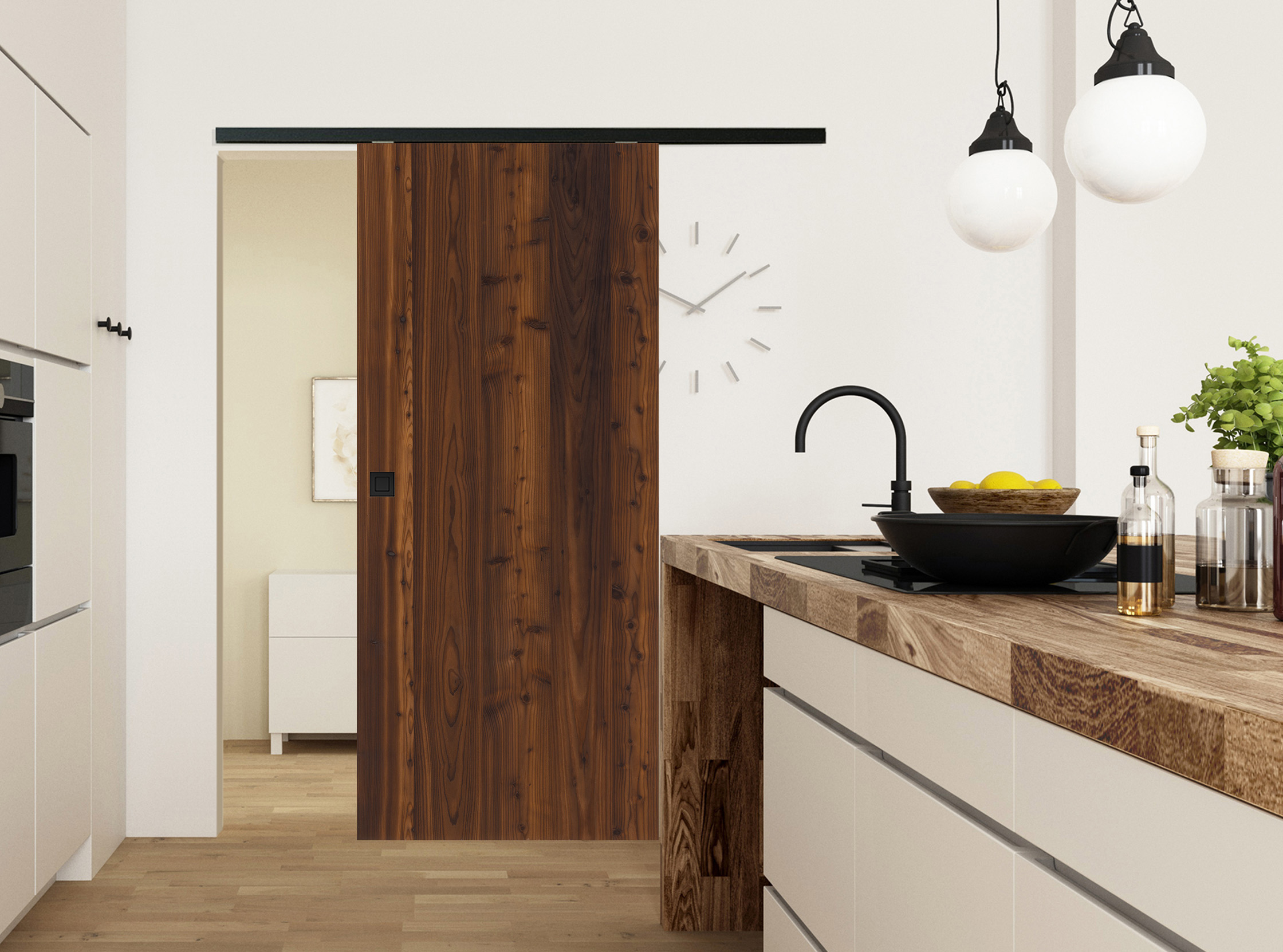 Charakterstarke Natur: Unsere Echtholztür Furnier Antik Lärche Smoke überzeugt mit markanten Astlöchern und Rissen, welche mit einem schwarzen Vlies hinterlegt sind. Dadurch entsteht eine einzigartige Optik und Haptik, wie sie aus der freien Natur bekannt ist. Die vertikale Zusammensetzung der Lärchenfurniere erzeugt eine wildwüchsige und außergewöhnliche Längsoptik - mehr Natürlichkeit geht kaum. Das heimische Lärchenholz ist besonders hochwertig und zählt zu den härtesten Hölzern. Bei diesem Furnier wird das Lärchenholz geräuchert und erhält dadurch einen braunen bis dunkelbraunen Farbton. Das daraus resultierende kontrastreiche Farbspiel macht diese Innentür zu einem charakterstarken Unikat und zu einem Highlight in jedem Wohnraum. Die Mattlackierung erzeugt zudem eine sehr moderne Wirkung. Als Schiebetür bietet sie nicht nur einen hohen Raumkomfort, sondern ist auch eine platzsparende Lösung. Hierfür stehen verschiedenen Schiebetürsysteme zur Auswahl. Passend zur Tür führen wir auch Schiebetürzargen in Lärche Smoke im Sortiment.