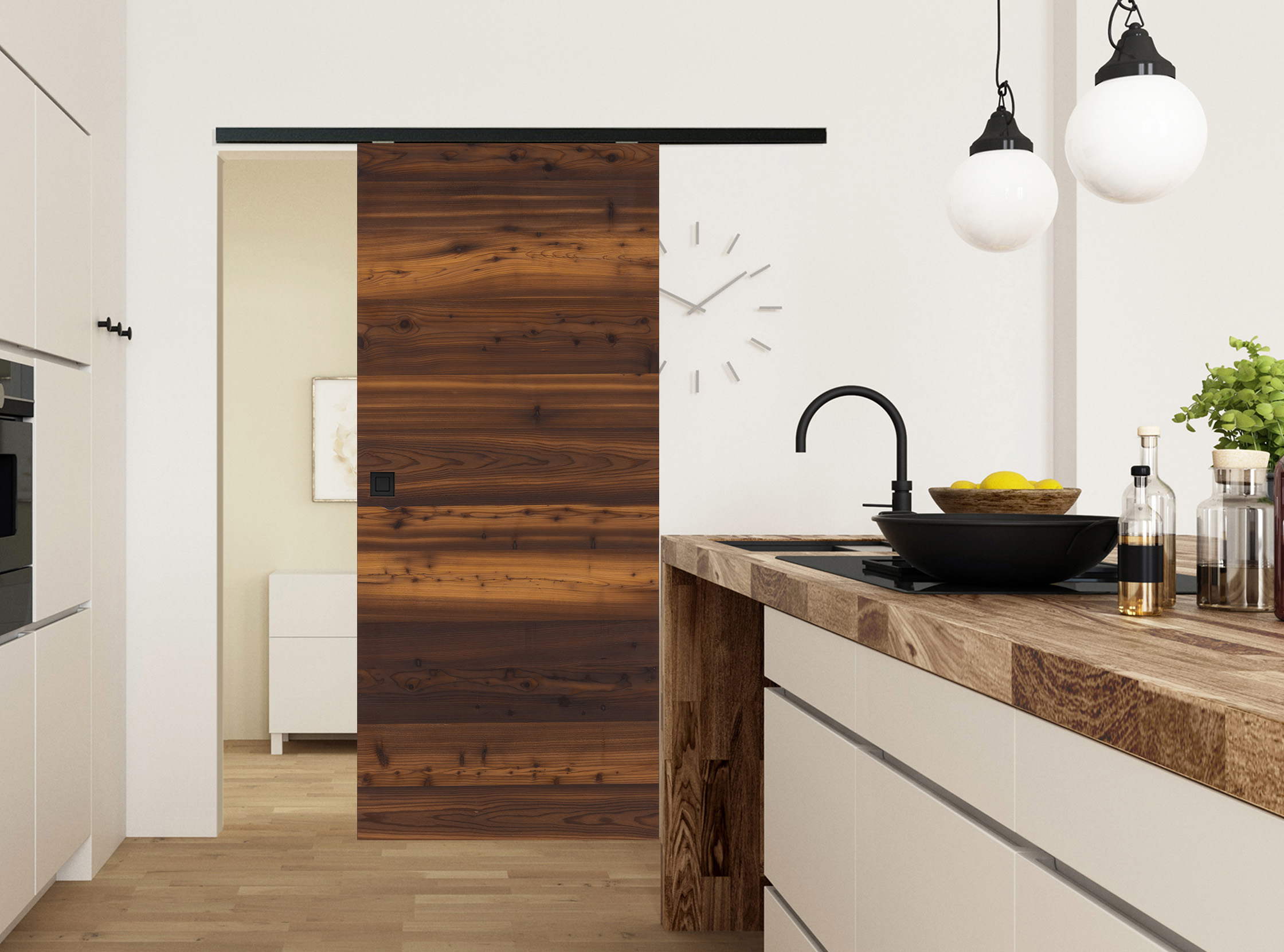 Charakterstarke Natur: Unsere Echtholztür Furnier Antik Lärche Smoke quer überzeugt mit markanten Astlöchern und Rissen, welche mit einem schwarzen Vlies hinterlegt sind. Dadurch entsteht eine einzigartige Optik und Haptik, wie sie aus der freien Natur bekannt ist. Die horizontale Zusammensetzung der Lärchenfurniere erzeugt eine wildwüchsige und außergewöhnliche Queroptik - mehr Natürlichkeit geht kaum. Das heimische Lärchenholz ist besonders hochwertig und zählt zu den härtesten Hölzern. Bei diesem Furnier wird das Lärchenholz geräuchert und erhält dadurch einen braunen bis dunkelbraunen Farbton. Das daraus resultierende kontrastreiche Farbspiel macht diese Innentür zu einem charakterstarken Unikat und zu einem Highlight in jedem Wohnraum. Die Mattlackierung erzeugt zudem eine sehr moderne Wirkung. Als Schiebetür bietet sie nicht nur einen hohen Raumkomfort, sondern ist auch eine platzsparende Lösung. Hierfür stehen verschiedenen Schiebetürsysteme zur Auswahl. Passend zur Tür führen wir auch Schiebetürzargen in Lärche Smoke im Sortiment.