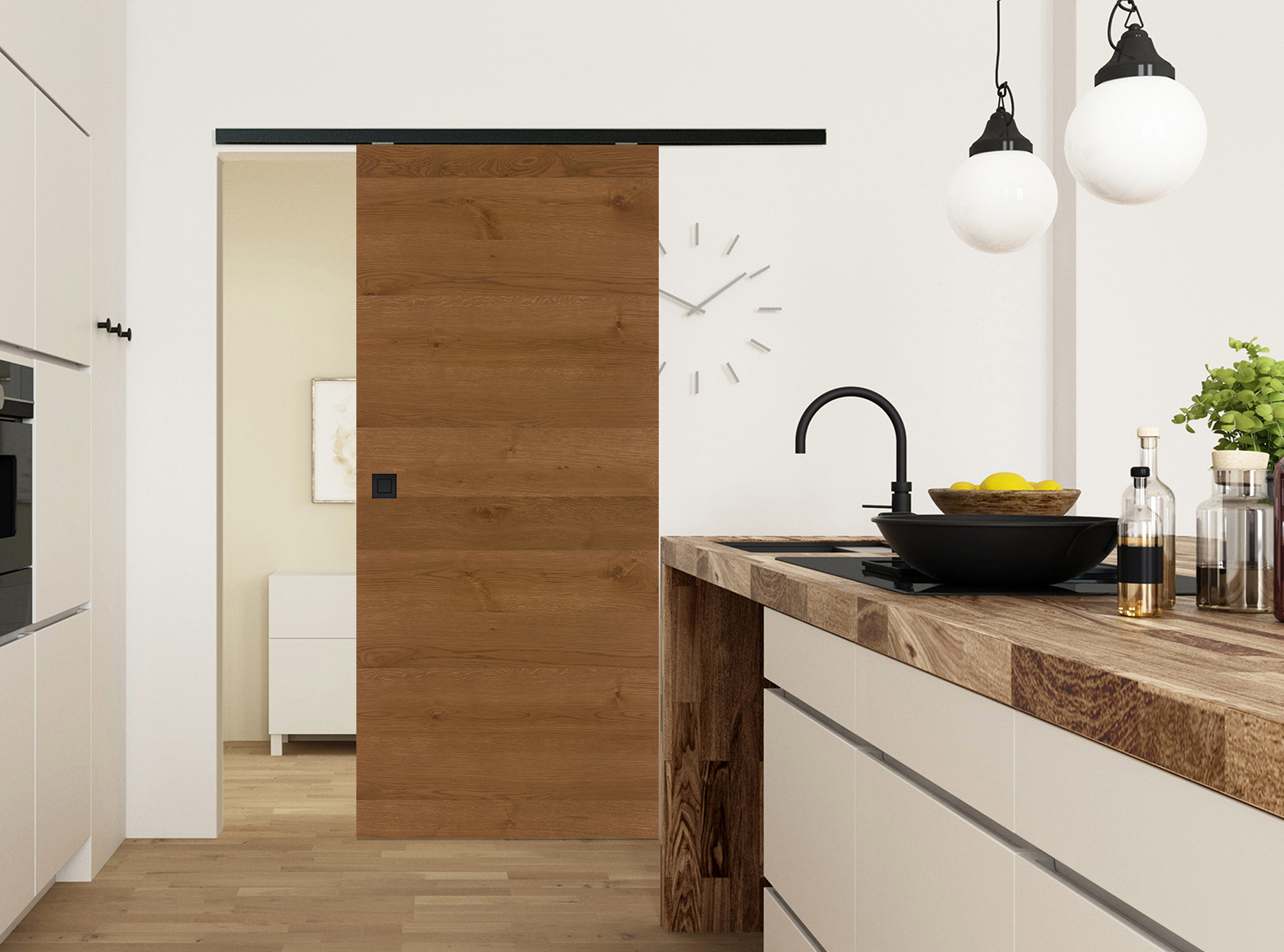 Individuelle Wuchsmerkmale: Unser astiges Edelfurnier überzeugt mit einem modernen und markanten Erscheinungsbild. Durch das rustikale Holzbild wird die natürliche Eleganz des Eichenholzes dieser Echtholztür unterstrichen und dadurch ein besonders lebendiges Wohngefühl geschaffen. Als Holzschiebetür mit dem Schiebetürsystem Classic 50/120 oder Basic 80 bietet die Tür eine platzsparende Lösung, einen flexiblen Raumtrenner sowie echte Barrierefreiheit.