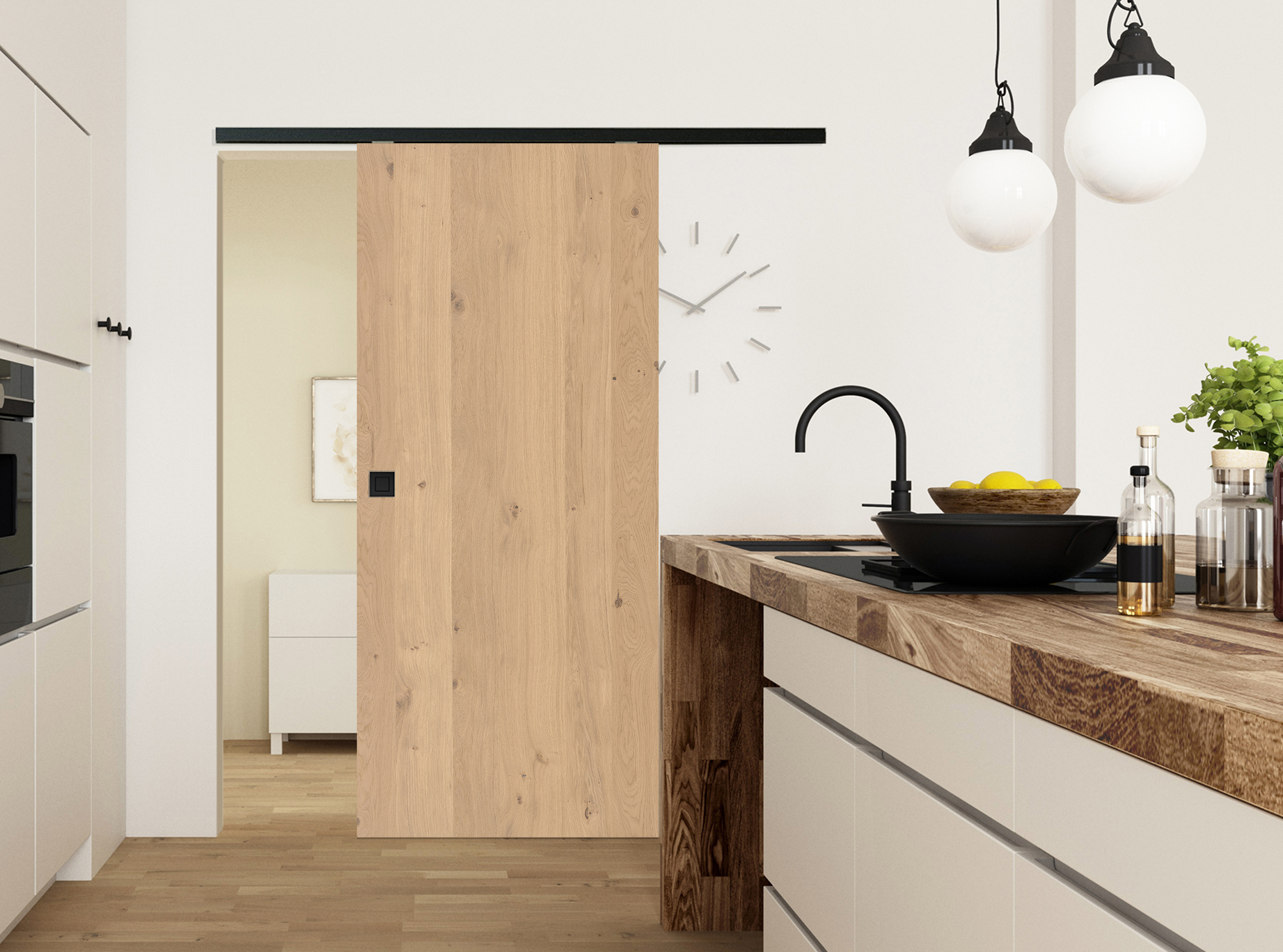 Individuelle Wuchsmerkmale: Unser astiges Edelfurnier überzeugt mit einem modernen und markanten Erscheinungsbild. Durch das rustikale Holzbild wird die natürliche Eleganz des Eichenholzes dieser Echtholztür unterstrichen und dadurch ein besonders lebendiges Wohngefühl geschaffen. Als Holzschiebetür mit dem Schiebetürsystem Classic 50/120 oder Basic 80 bietet die Tür eine platzsparende Lösung, einen flexiblen Raumtrenner sowie echte Barrierefreiheit.