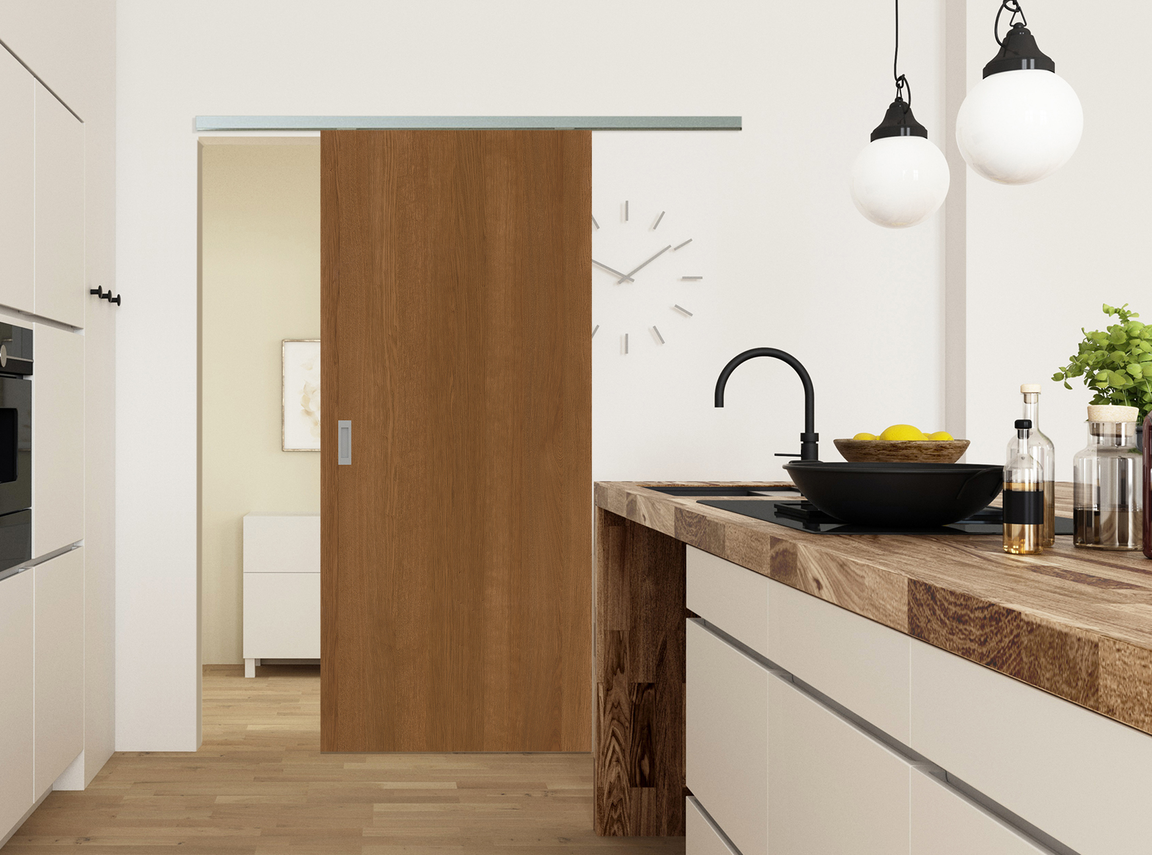 Optische Gliederung: Furniere sind dünne Holzblätter – beim Schneiden des Baumstammes werden die individuellen Wuchsmerkmale Blatt für Blatt freigelegt. Die besondere Streifen-Optik entsteht dadurch, dass die Furnierblätter nebeneinandergelegt und verleimt werden. Das Verfahren ist dadurch besonders nachhaltig, da hier kaum Ausschuss entsteht. Gleichzeitig wirkt die Echtholztür dadurch aber auch besonders exklusiv. Als Holzschiebetür mit dem Schiebetürsystem Classic 50/120 oder Basic 80 bietet die Tür eine platzsparende Lösung, einen flexiblen Raumtrenner sowie echte Barrierefreiheit.