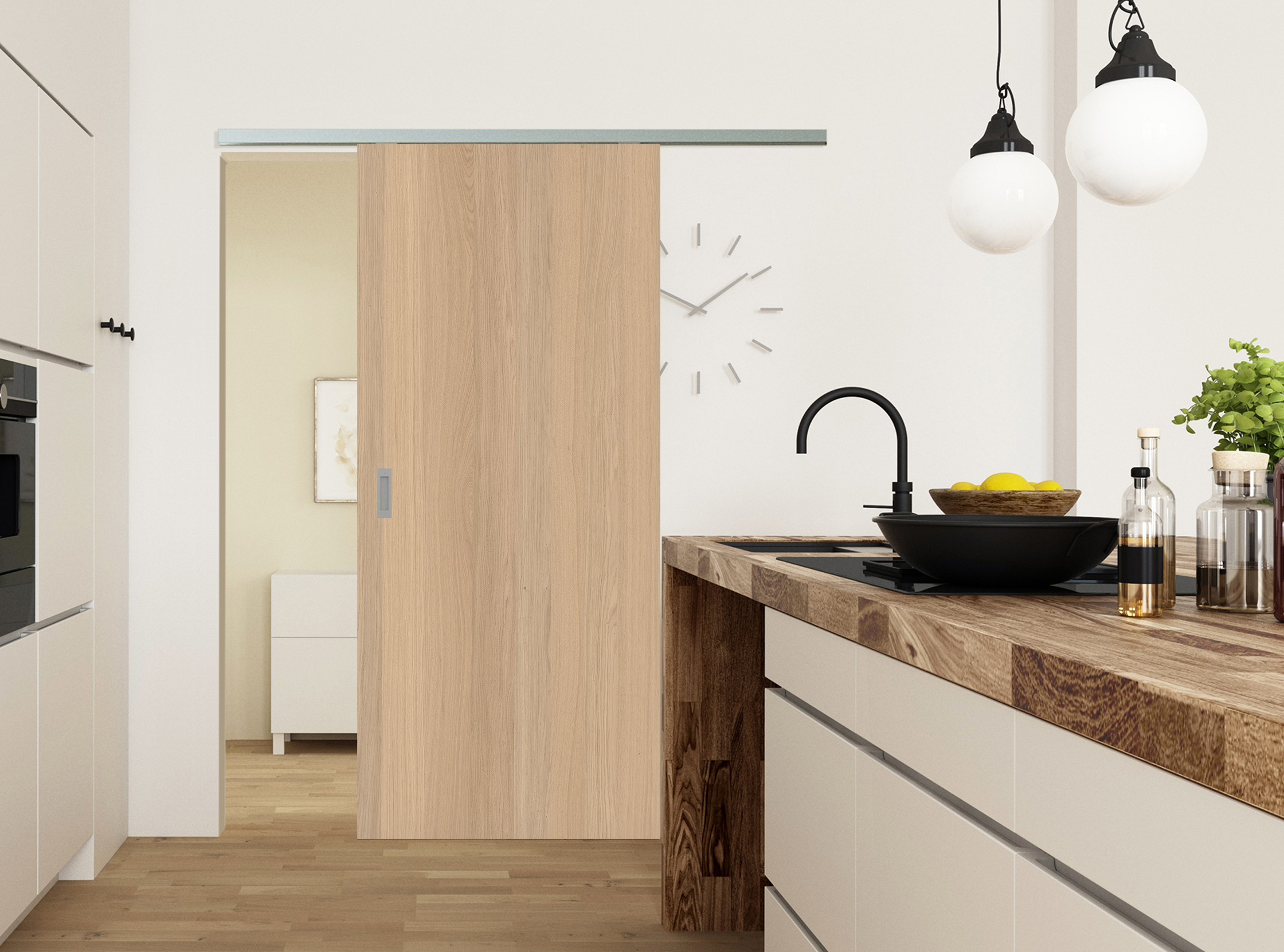 Optische Gliederung: Furniere sind dünne Holzblätter – beim Schneiden des Baumstammes werden die individuellen Wuchsmerkmale Blatt für Blatt freigelegt. Die besondere Streifen-Optik entsteht dadurch, dass die Furnierblätter nebeneinandergelegt und verleimt werden. Das Verfahren ist dadurch besonders nachhaltig, da hier kaum Ausschuss entsteht. Gleichzeitig wirkt die Echtholztür dadurch aber auch besonders exklusiv. Als Holzschiebetür mit dem Schiebetürsystem Classic 50/120 oder Basic 80 bietet die Tür eine platzsparende Lösung, einen flexiblen Raumtrenner sowie echte Barrierefreiheit.