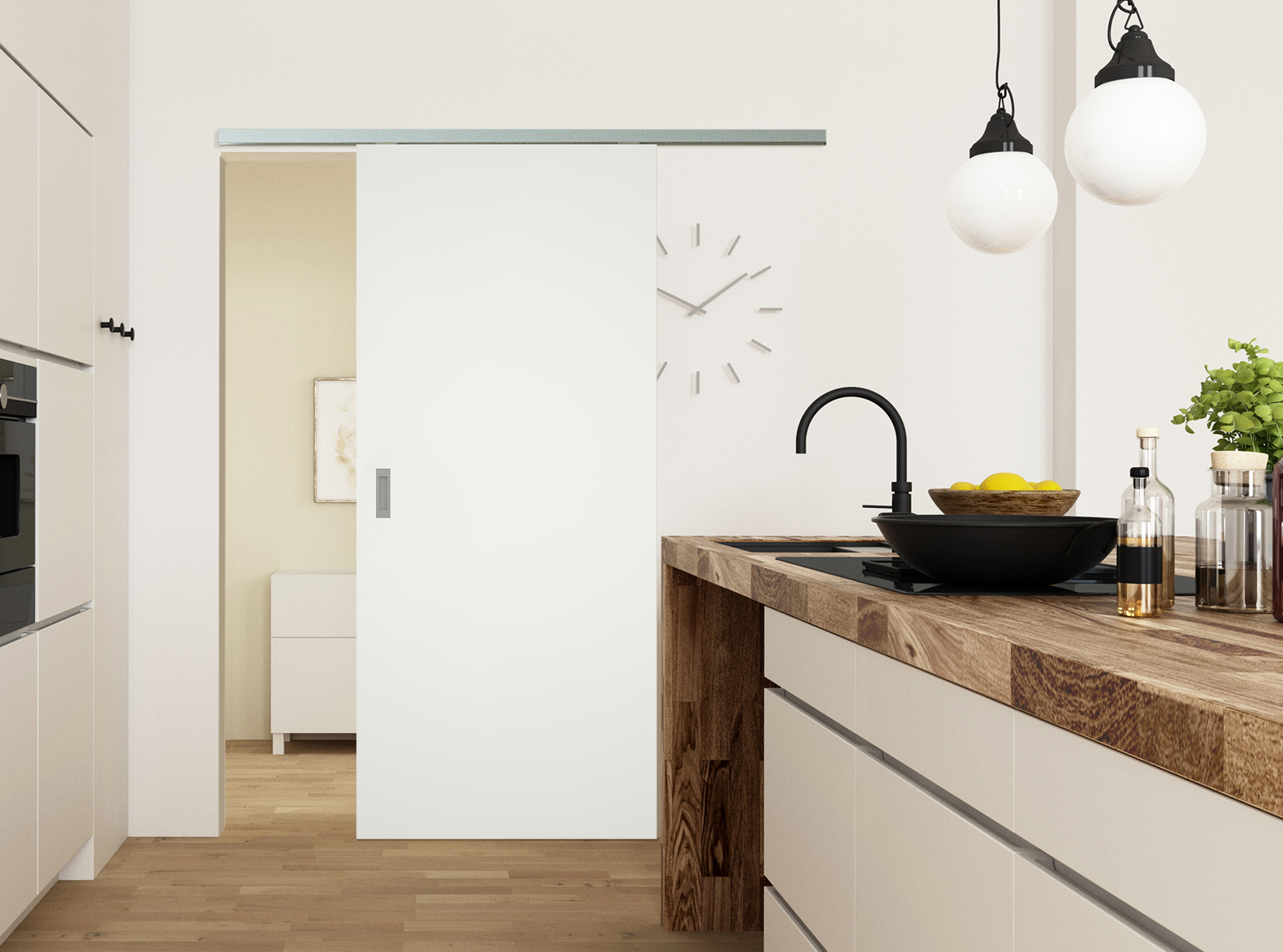 Einfach schlicht: In einem gedämpften Weißton und ohne viel Schnickschnack überzeugen glatte weiße Türen, insbesondere in Hinblick auf die Kombinierbarkeit mit verschiedenen Wohn- und Einrichtungsstilen - eben ein zeitloser Klassiker. Als Holzschiebetür mit dem Schiebetürsystem Classic 50/120 oder Basic 80 bietet die Tür eine platzsparende Lösung, einen flexiblen Raumtrenner sowie echte Barrierefreiheit.