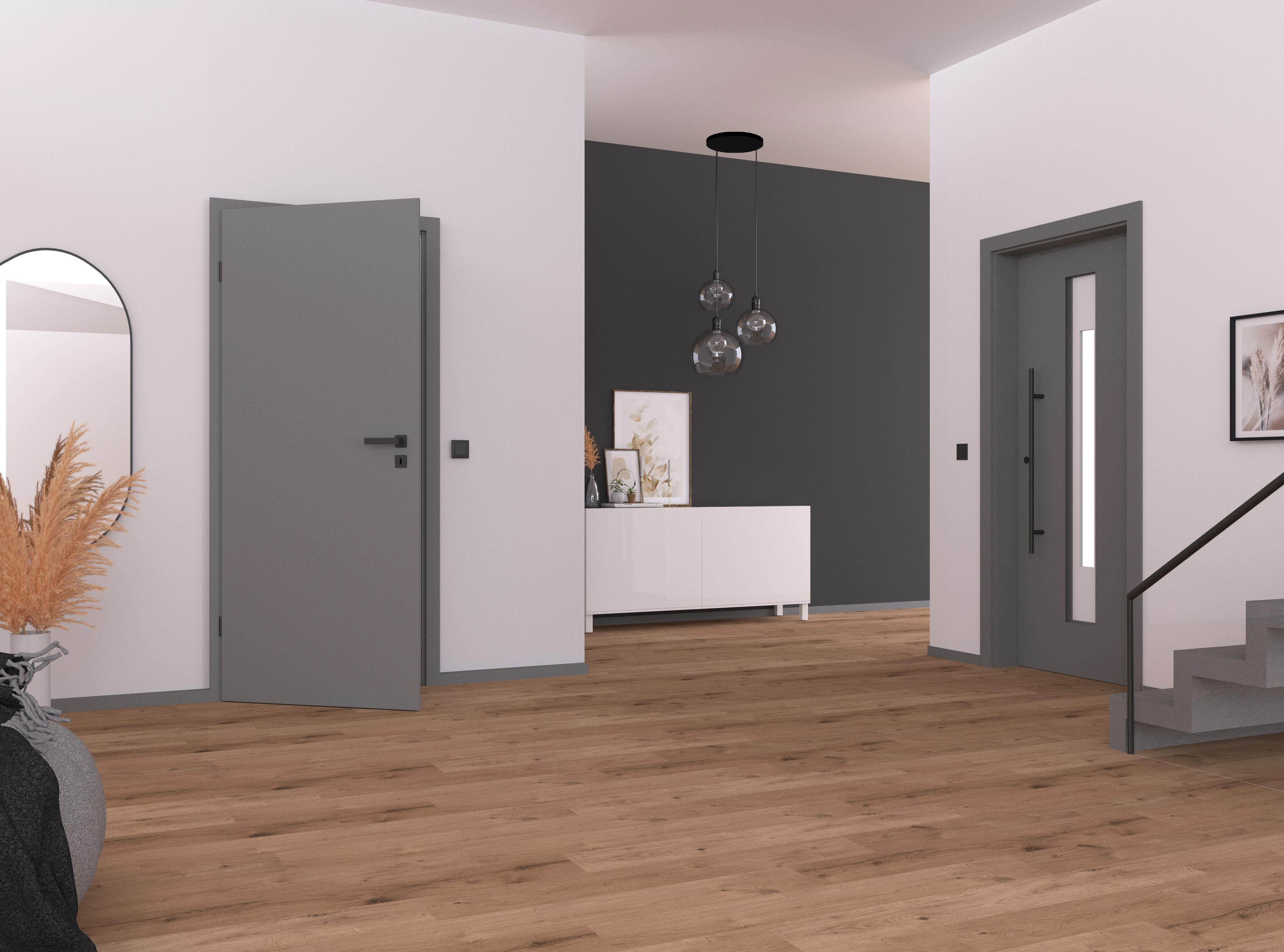 Schlicht und angesagt: In der zeitlosen Farbe Mineralgrau, ähnlich RAL 7037, und ohne viel Schnickschnack überzeugen die glatten graue Türen, insbesondere in Hinblick auf die Kombinierbarkeit mit verschiedenen Wohn- und Einrichtungsstilen. Vor allem Farben lassen sich dazu besonders gut integrieren und treten intensiv in den Vordergrund. Unsere glatte Tür Mineralgrau hat eine lackierte Oberfläche, das Türblatt verfügt über eine Designkante, die mit ihrem minimalen Kantenradius die moderne Optik betont. Passend zur Tür führen wir auch Zargen in Mineralgrau im Sortiment.