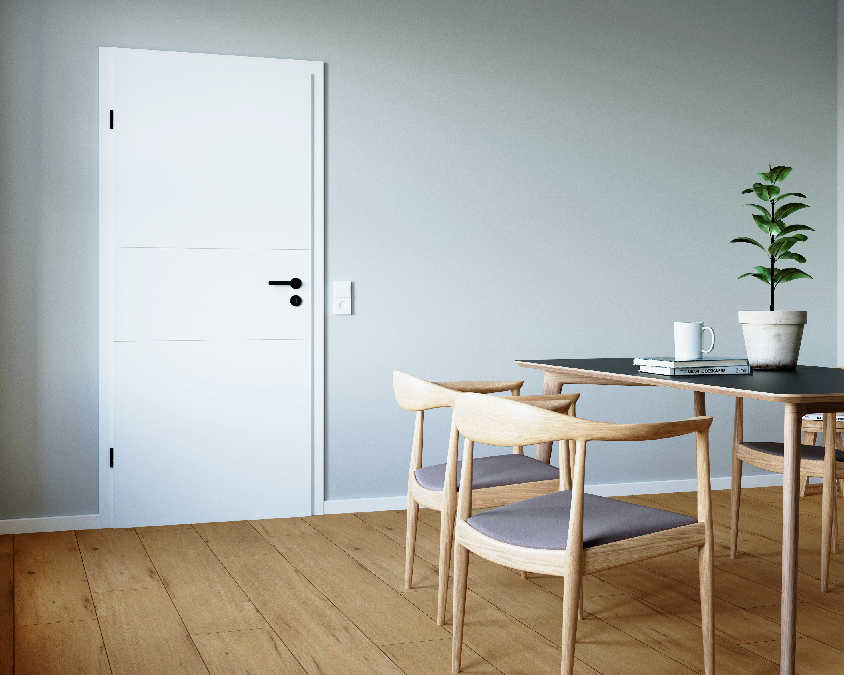 La Superba - die Stolze: Genua ist eine moderne und maritime Stadt im Norden Italiens. Feine 3 mm Rillenfräsungen verleihen unserer Genua eine schlichte, aber auch erfrischende Eleganz, weshalb sie auch zu den beliebtesten weißen Innentüren zählt. Unsere Genua GA3 verfügt dabei über zwei horizontale Linien, die das geradlinige Design der Tür betonen. Die lackierte Oberfläche strahlt in einem der weißesten Weißtöne in Anlehnung an RAL 9003. Das Türblatt verfügt über eine Designkante, die mit ihrem minimalen Kantenradius das moderne Design betont. Passend zur Tür führen wir auch Zargen und Fußleisten im Farbton Weiß 9003 im Sortiment. Für einen modernen Kontrast zum Weiß empfehlen wir den Einsatz von schwarzen Beschlägen.