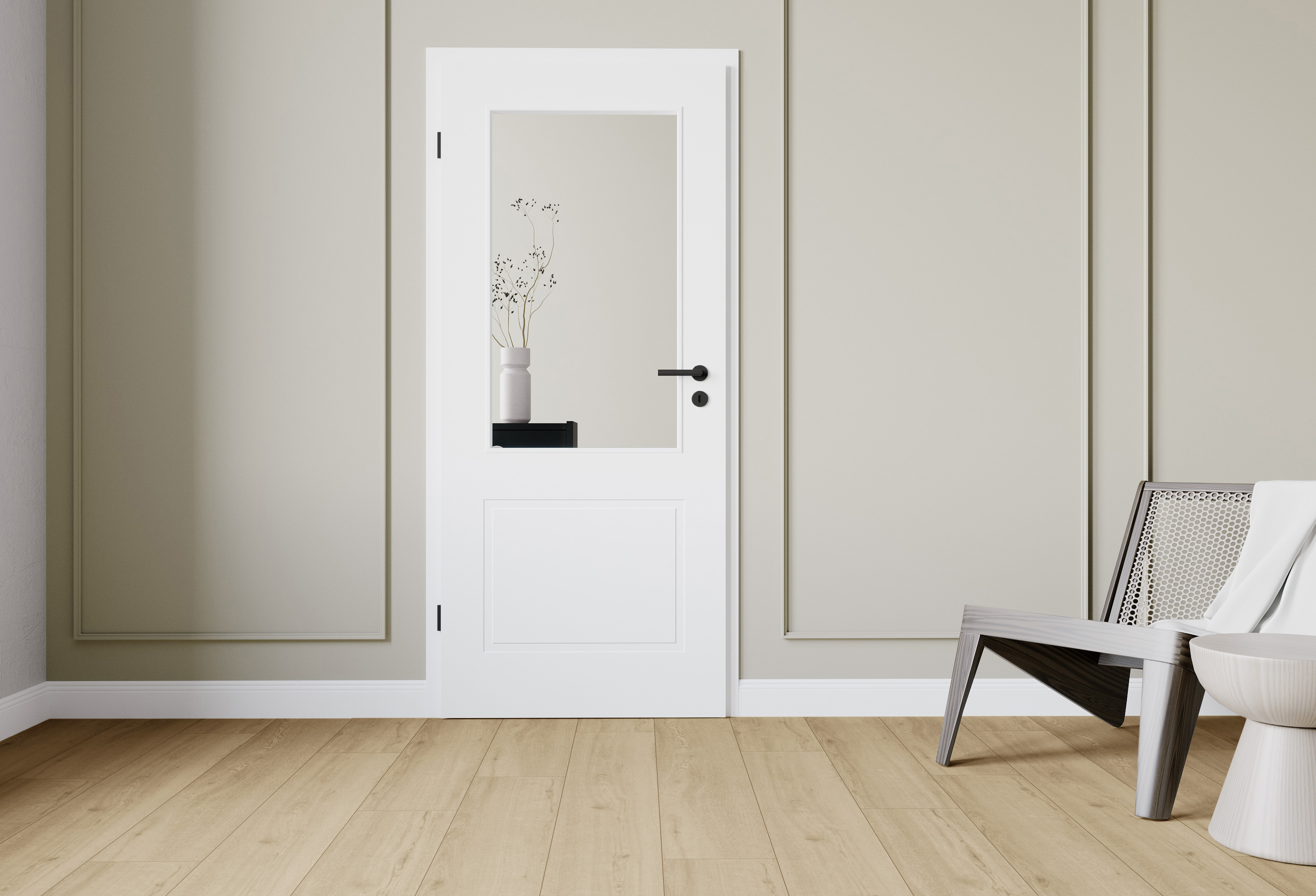 Moderne Neuinterpretation: Bergamo ist nicht nur die Perle Norditaliens, sondern überzeugt auch als Neuinterpretation der klassischen Stiltür im Farbton Weißlack 3.0, in Anlehnung an RAL 9003. Die 30 mm breiten Prägungen unserer Bergamo 2G sorgen für ein edles, aber dennoch schlichtes Design, das sich optimal in moderne Raumkonzepte integrieren lässt. Das lackierte Türblatt verfügt über eine Designkante, die mit ihrem minimalen Kantenradius das moderne Design betont. Passend zur Tür führen wir auch Zargen und Fußleisten im Farbton Weiß 9003 im Sortiment. Für einen modernen Kontrast zum Weiß empfehlen wir den Einsatz von schwarzen Beschlägen.