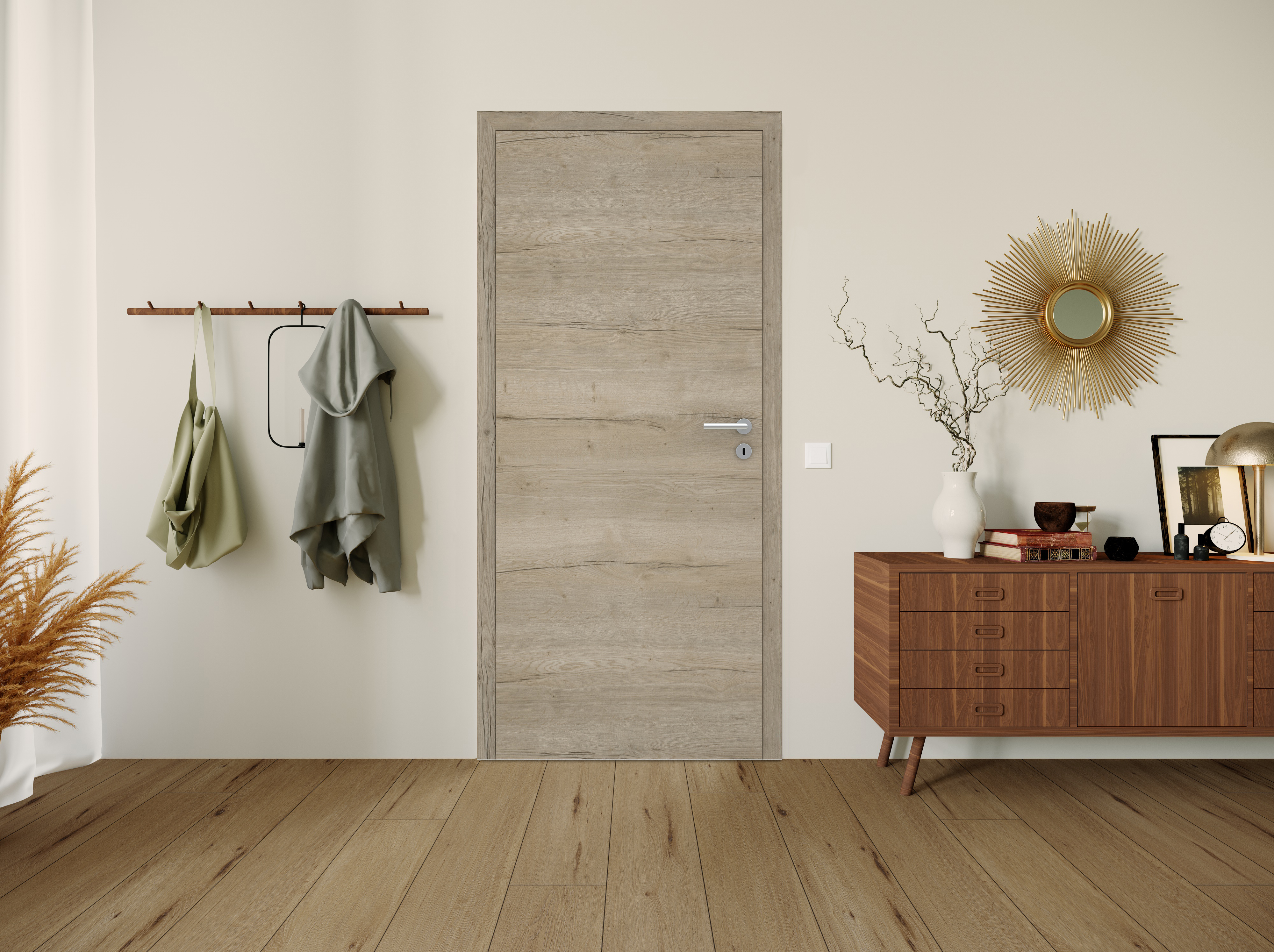 Helles Holzfeeling mit mediterranem Flair: Die Pinie ist eine italienische Kiefernart und hat ihren Ursprung im nördlichen Mittelmeer. Das Dekor wird zunehmend beliebter und besticht durch eine individuelle Maserung mit kleinen Astspuren. Das helle Design mit spürbarer Holzstruktur wirkt modern, ist robust und lässt sich einfach mit verschiedenen Wohnstilen und Wandfarben kombinieren. Als stumpfeinschlagende Tür, die eine einheitliche Fläche mit der Zarge bildet, wirkt das Design besonders modern und fügt sich dezent in den Wohnraum ein.