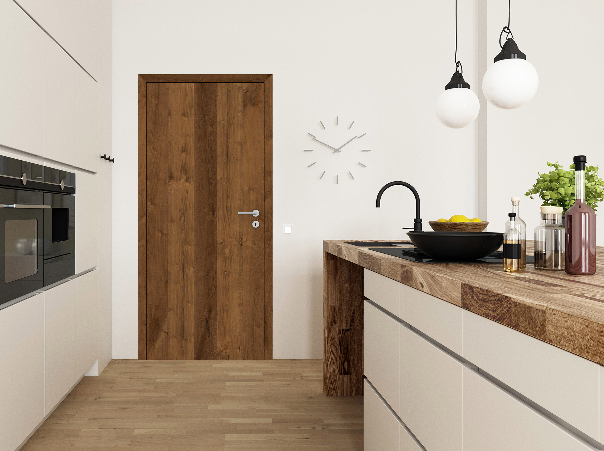 Charakterstarke Natur: Unsere Echtholztür Furnier Antik Eiche Bronze überzeugt mit markanten Astlöchern und Rissen, welche mit einem schwarzen Vlies hinterlegt sind. Dadurch entsteht eine einzigartige Optik und Haptik, wie sie aus der freien Natur bekannt ist. Die vertikale Zusammensetzung der Eichenfurniere erzeugt eine wildwüchsige und außergewöhnliche Längsoptik - mehr Natürlichkeit geht kaum. Das daraus resultierende lebhafte Farbspiel in warmen Brauntönen macht diese Innentür zu einem charakterstarken Unikat und zu einem Highlight in jedem Wohnraum. Die Mattlackierung erzeugt zudem eine sehr moderne Wirkung. Als stumpfeinschlagende Tür schließt ihr Türblatt bündig mit der Zarge. Dementsprechend sind auch die Bänder nicht sichtbar. Hieraus entsteht eine besonders reduzierte und moderne Optik, die optimal mit dem minimalistischen Wohnstil harmoniert. Angeboten wird die Innentür als Element mit passender Zarge.