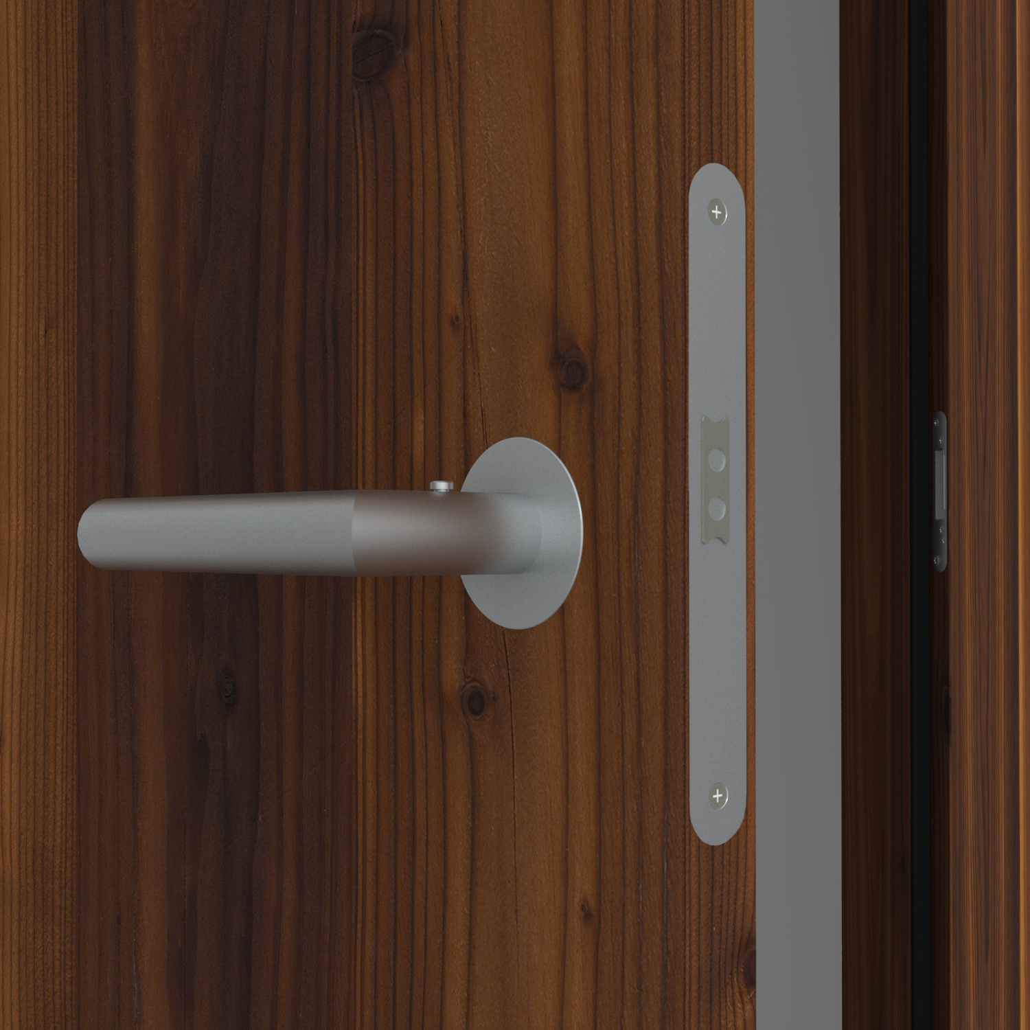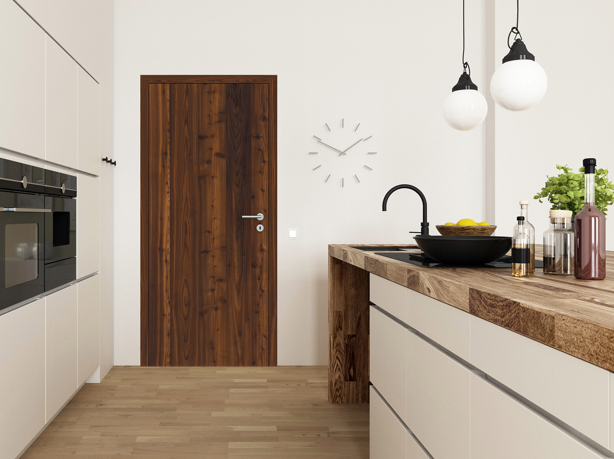 Charakterstarke Natur: Unsere Echtholztür Furnier Antik Lärche Smoke überzeugt mit markanten Astlöchern und Rissen, welche mit einem schwarzen Vlies hinterlegt sind. Dadurch entsteht eine einzigartige Optik und Haptik, wie sie aus der freien Natur bekannt ist. Die vertikale Zusammensetzung der Lärchenfurniere erzeugt eine wildwüchsige und außergewöhnliche Längsoptik - mehr Natürlichkeit geht kaum. Das heimische Lärchenholz ist besonders hochwertig und zählt zu den härtesten Hölzern. Bei diesem Furnier wird das Lärchenholz geräuchert und erhält dadurch einen braunen bis dunkelbraunen Farbton. Das daraus resultierende kontrastreiche Farbspiel macht diese Innentür zu einem charakterstarken Unikat und zu einem Highlight in jedem Wohnraum. Die Mattlackierung erzeugt zudem eine sehr moderne Wirkung. Als stumpfeinschlagende Tür schließt ihr Türblatt bündig mit der Zarge. Dementsprechend sind auch die Bänder nicht sichtbar. Hieraus entsteht eine besonders reduzierte und moderne Optik, die optimal mit dem minimalistischen Wohnstil harmoniert. Angeboten wird die Innentür als Element mit passender Zarge.