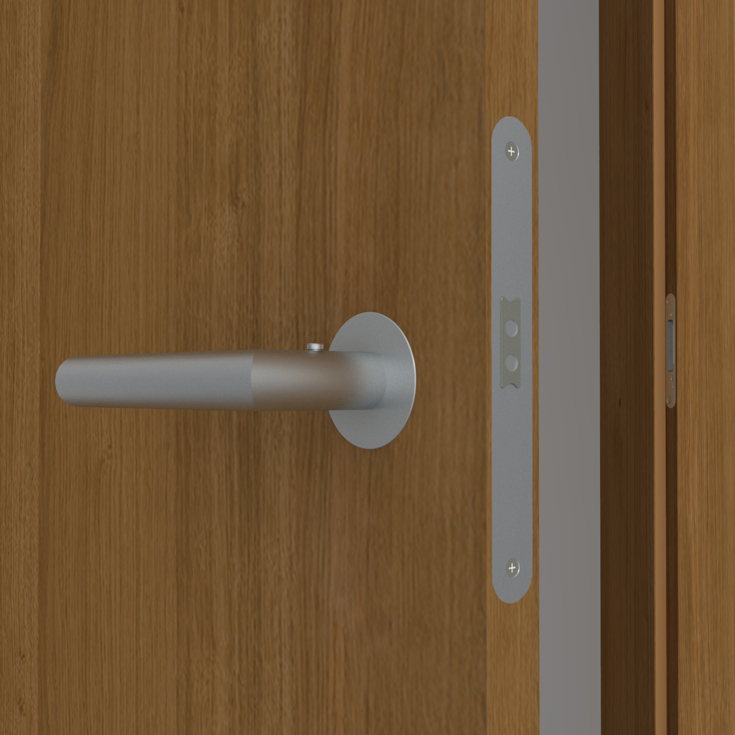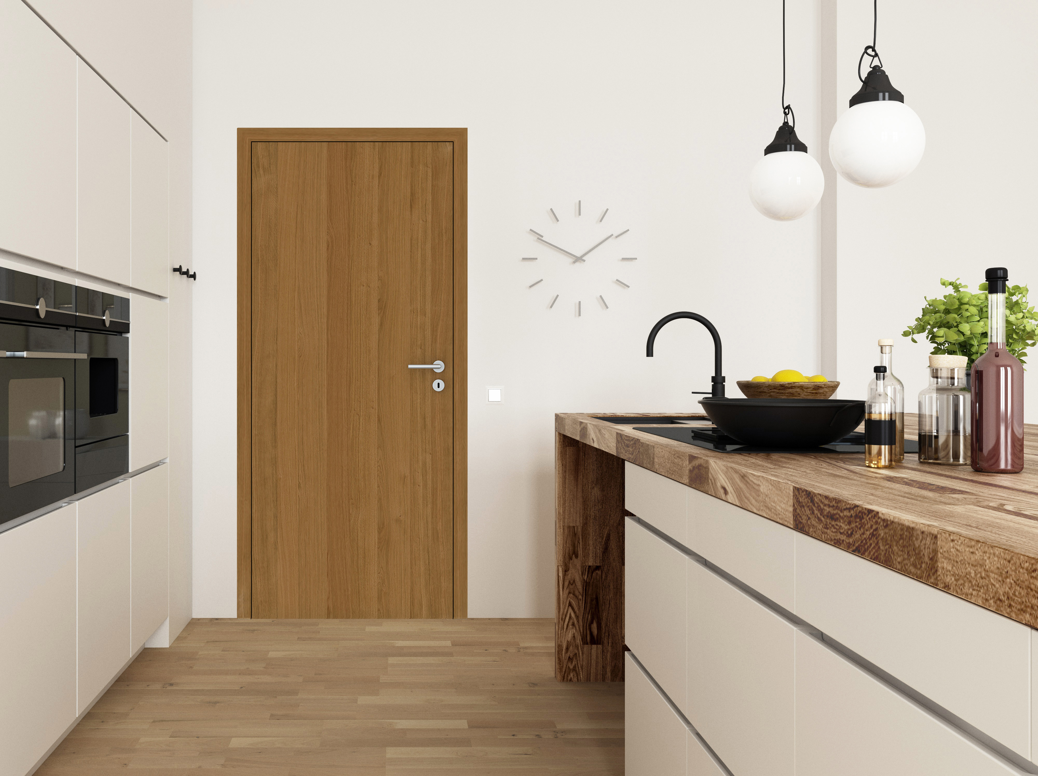 Optische Gliederung: Furniere sind dünne Holzblätter – beim Schneiden des Baumstammes werden die individuellen Wuchsmerkmale Blatt für Blatt freigelegt. Die besondere Streifen-Optik entsteht dadurch, dass die Furnierblätter nebeneinandergelegt und verleimt werden. Das Verfahren ist dadurch besonders nachhaltig, da hier kaum Ausschuss entsteht. Gleichzeitig wirkt die Echtholztür dadurch aber auch besonders exklusiv. Als stumpfeinschlagende Tür, die eine einheitliche Fläche mit der Zarge bildet, wirkt das Design besonders modern und fügt sich dezent in den Wohnraum ein.