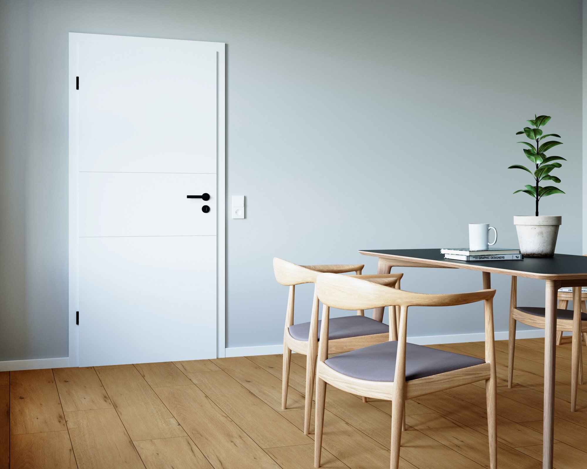 La Superba - die Stolze: Genua ist eine moderne und maritime Stadt im Norden Italiens. Feine 3 mm Rillenfräsungen verleihen unserer Genua eine schlichte, aber auch erfrischende Eleganz, weshalb sie auch zu den beliebtesten weißen Innentüren zählt. Unsere Genua GA3 verfügt dabei über zwei horizontale Linien, die das geradlinige Design der Tür betonen. Die lackierte Oberfläche strahlt in einem der weißesten Weißtöne in Anlehnung an RAL 9003. Das Türblatt verfügt über eine Designkante, die mit ihrem minimalen Kantenradius das moderne Design betont. Passend zur Tür führen wir auch Zargen und Fußleisten im Farbton Weiß 9003 im Sortiment. Für einen modernen Kontrast zum Weiß empfehlen wir den Einsatz von schwarzen Beschlägen.