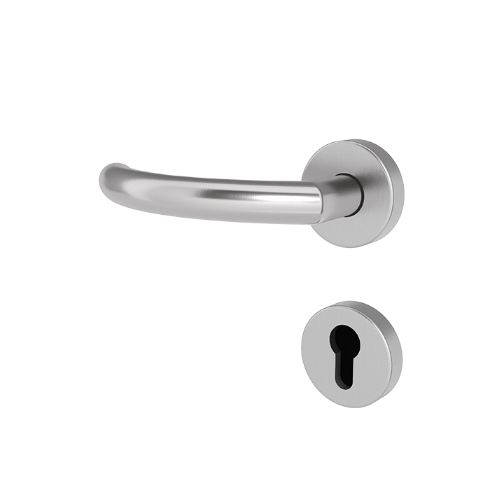 Extrahalt: Durch die besondere Formgebung bietet der Türgriff Langeoog 4 FS zusätzlichen Halt. Der Türdrücker ohne Hochhaltefeder mündet in einer runden Rosette. Die festdrehbar gelagerte Klipprosette sorgt für eine stabile und langlebige Nutzung. Die Oberfläche aus matt gebürstetem Edelstahl bietet eine angenehme Haptik, ist äußerst widerstandsfähig und reduziert Fingerabdrücke. Diese Drückergarnitur ist gemäß DIN 18273 und EN 1906 geprüft, entspricht der Beanspruchungsklasse IV und erfüllt damit höchste Anforderungen an Brand- und Feuerschutz. Zusätzlich ist das Schloss mit einem Profilzylinder ausgestattet, was für erhöhte Sicherheit und vielseitige Einsatzmöglichkeiten sorgt.