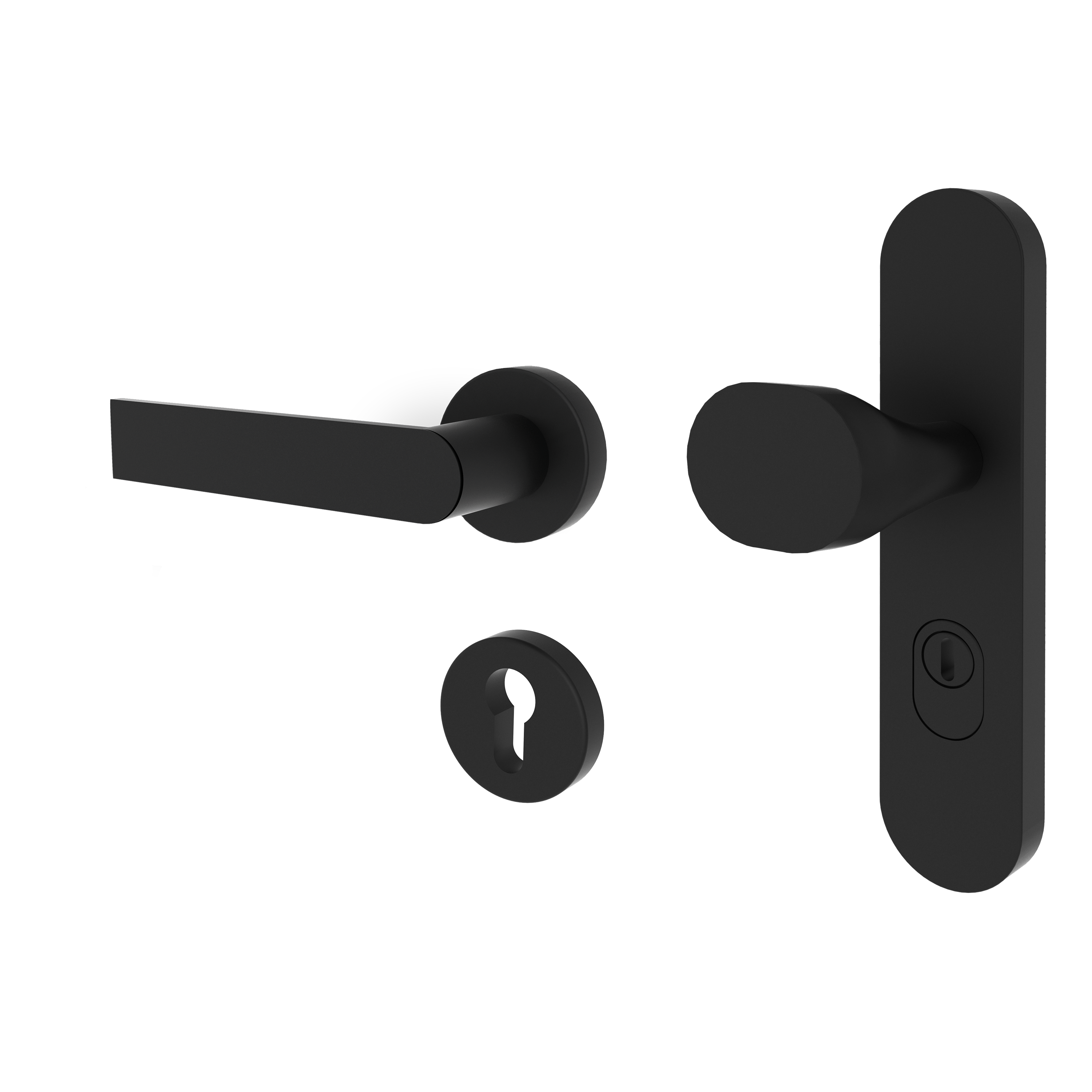 Markantes Design: Unser Türgriff Gomero bietet ein sehr geradliniges Design in Mattschwarz. Runde und eckige Formen erzeugen eine stilsichere Optik und eine moderne Interpretation eines Türgriffs. Für einen besonderen Kontrast sorgt die Kombination mit unseren Türen in Weißlack 3.0. Die Schutzgarnitur mit einem massiven runden Langschild verfügt über einen einseitigen Türknauf mit Kernziehschutz sowie einer einseitigen, runden Rosettengarnitur. Geprüft nach DIN 18257-ES1 und DIN EN1906-EN2.