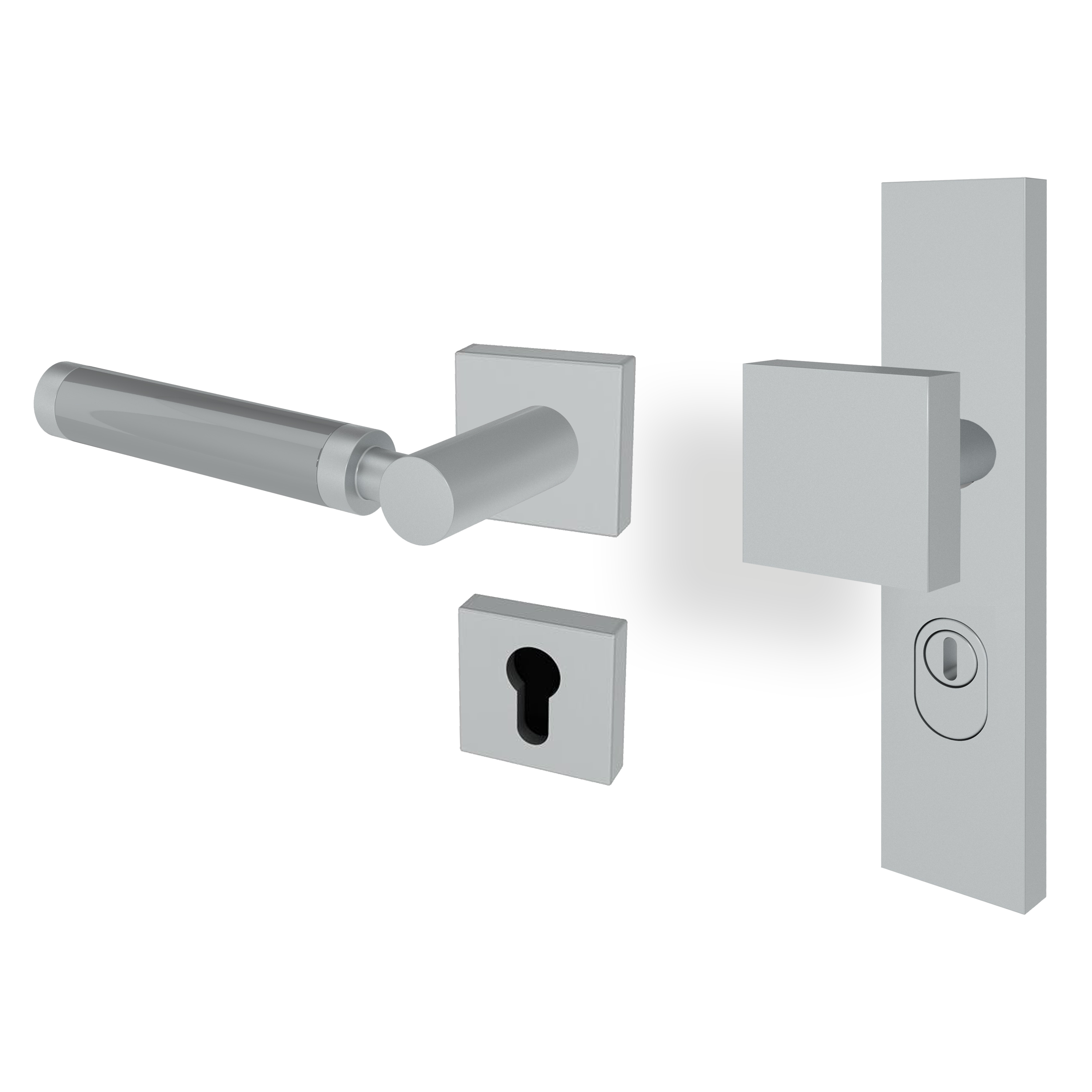 Besondere Ästhetik: Unser Türgriff Ibiza Z steht nicht nur für einen spannenden Materialmix, sondern ist auch ein exklusives Design-Element, das verschiedene Formen miteinander vereint. Die elegante Materialkombination setzt sich mit kleine Rillenverzierungen voneinander ab. Die Schutzgarnitur mit einem massiven eckigen Langschild verfügt über einen einseitigen Türknauf mit Kernziehschutz sowie einer einseitigen, eckigen Rosettengarnitur. Geprüft nach DIN 18257-ES1 und DIN EN1906-EN2.