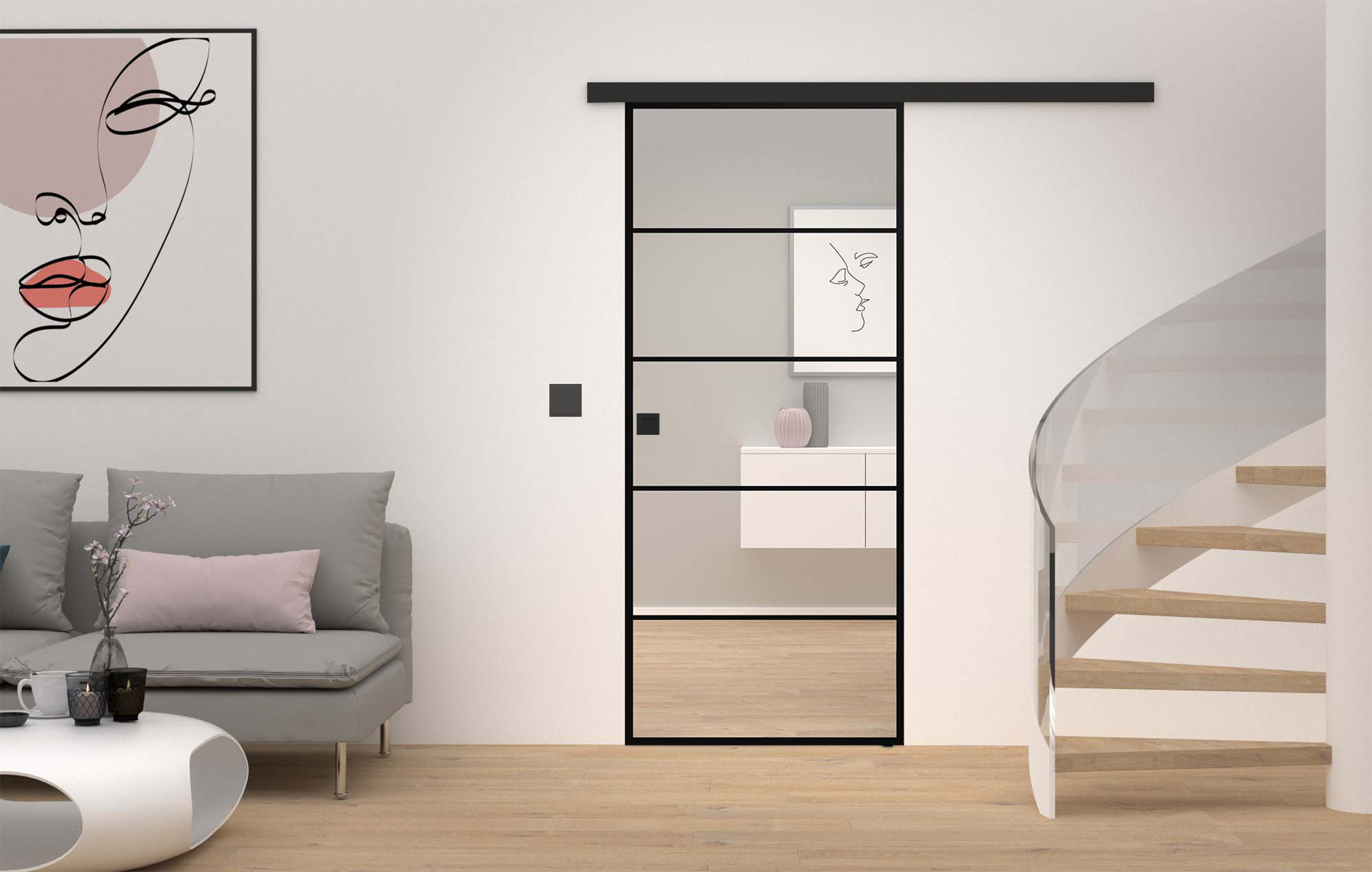 Loft-Design: Glasschiebetüren sind wahre Raumhighlights, denn sie verbinden und trennen Räume auf eine besonders platzsparende und moderne Weise. Zudem sorgen sie für eine hohe Lichtdurchflutung, wodurch eine offene, helle Raumatmosphäre entsteht. Unsere Blackmotive in verschiedenen Linien- und Gitterdesigns sind das Highlight in jedem Wohnraum. Die schwarze Pulverbeschichtung auf Klarglas sorgt für eine kontrastreiche Wirkung - besonders ist dabei vor allem die schwarze Kante. Aber auch andere Standardgläser sind möglich. Zu diesen Glasschiebetüren harmonieren vor allem passende Schließbleche und Schlösser in Schwarz.
