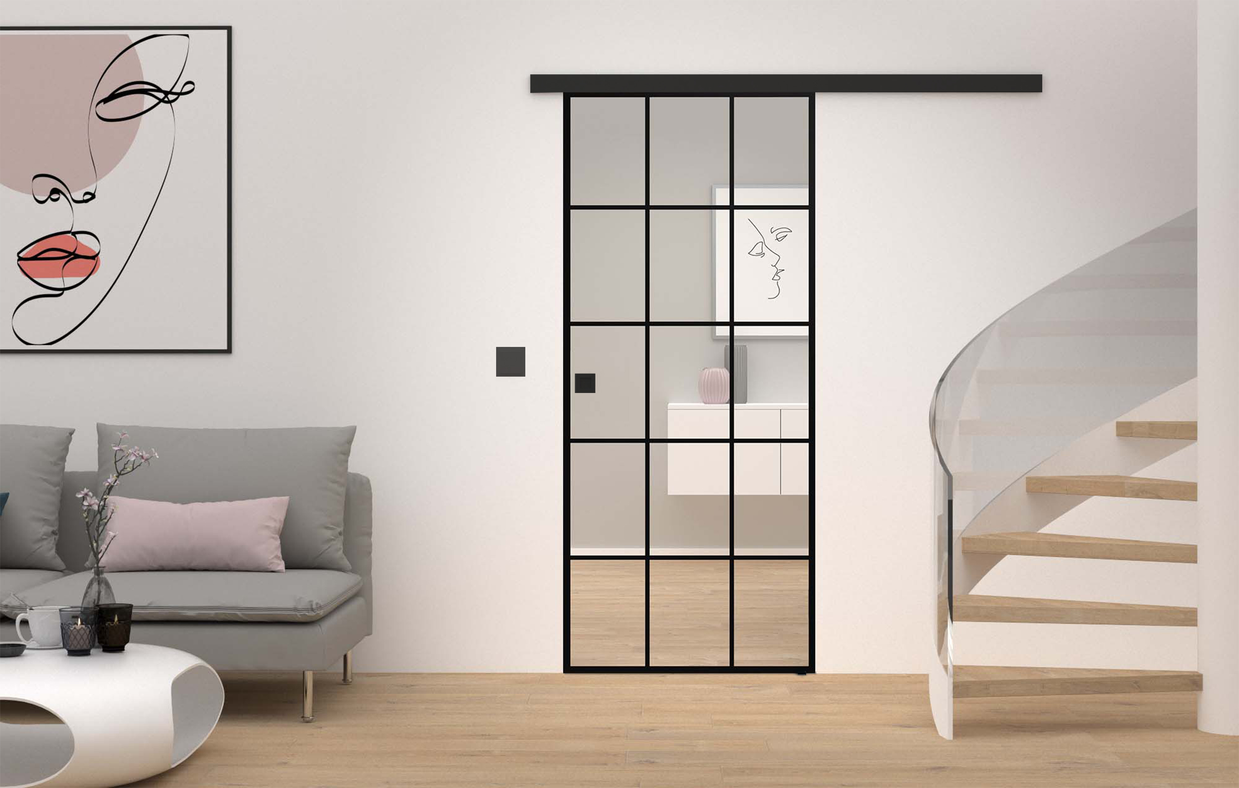 Loft-Design: Glasschiebetüren sind wahre Raumhighlights, denn sie verbinden und trennen Räume auf eine besonders platzsparende und moderne Weise. Zudem sorgen sie für eine hohe Lichtdurchflutung, wodurch eine offene, helle Raumatmosphäre entsteht. Unsere Blackmotive in verschiedenen Linien- und Gitterdesigns sind das Highlight in jedem Wohnraum. Die schwarze Pulverbeschichtung auf Klarglas sorgt für eine kontrastreiche Wirkung - besonders ist dabei vor allem die schwarze Kante. Aber auch andere Standardgläser sind möglich. Zu diesen Glasschiebetüren harmonieren vor allem passende Schließbleche und Schlösser in Schwarz.