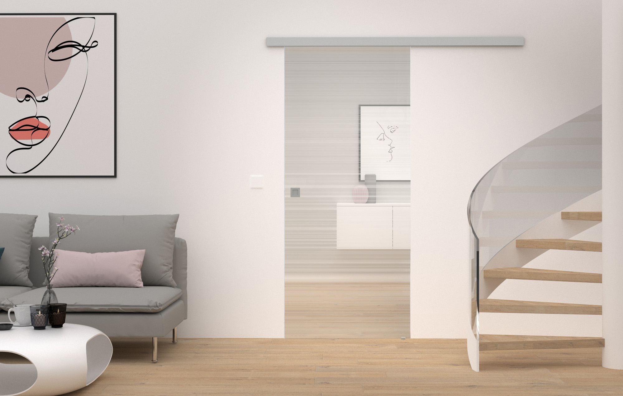 Die Magie der Dimensionen: Glasschiebetüren sind wahre Raumhighlights, denn sie verbinden und trennen Räume auf eine besonders platzsparende und moderne Weise. Zudem sorgen sie für eine hohe Lichtdurchflutung, wodurch eine offene, helle Raumatmosphäre entsteht. Kleinste Sandkörner zeichnen mit einem leichten Druck auffällige Motive in die Glasoberfläche. Durch die beidseitig versetzt angeordneten Motive entsteht ein 3D-Effekt, der für eine ganz besondere lebendige Wirkung im Raum sorgt.