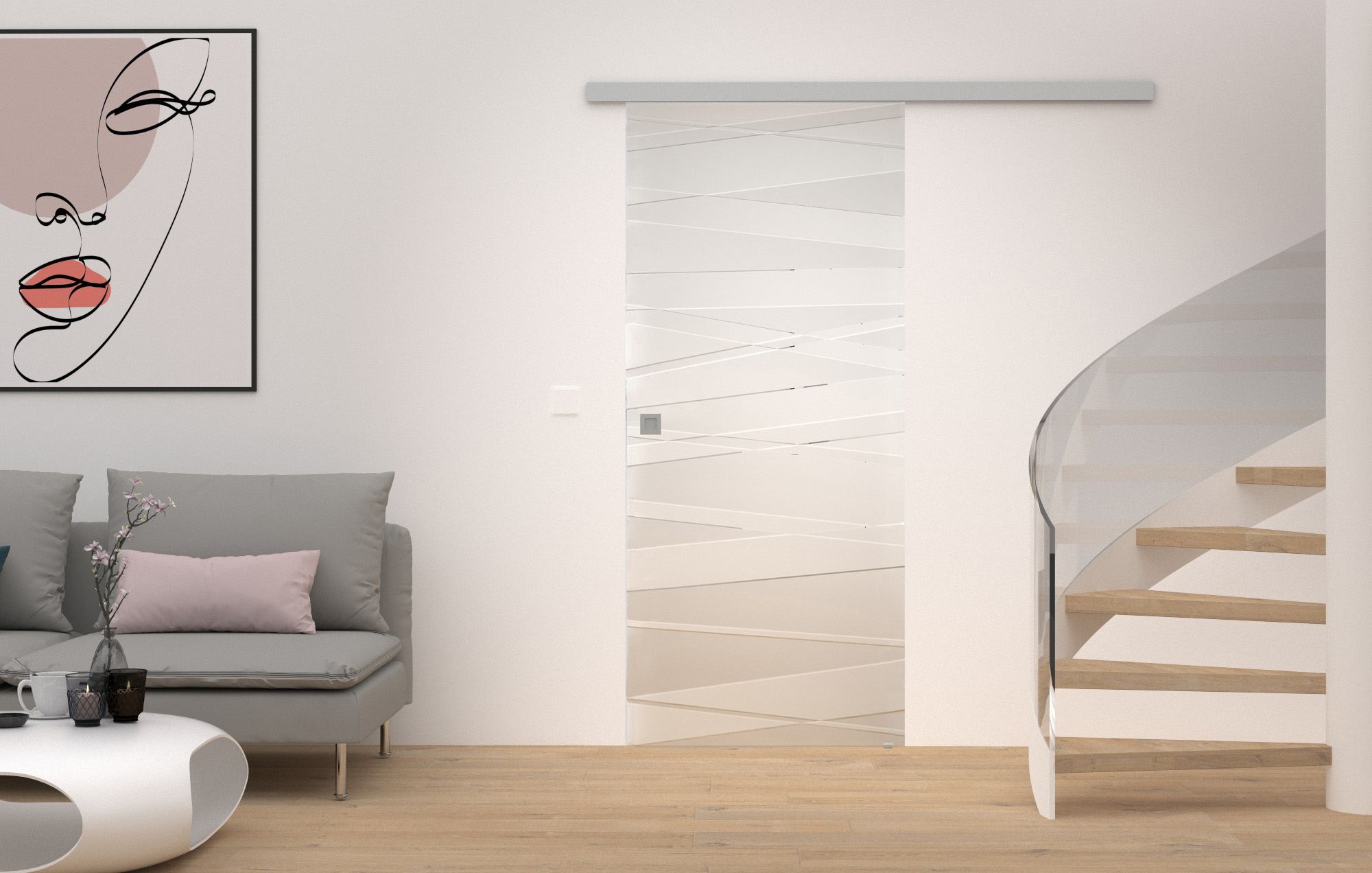 Die Magie der Dimensionen: Glasschiebetüren sind wahre Raumhighlights, denn sie verbinden und trennen Räume auf eine besonders platzsparende und moderne Weise. Zudem sorgen sie für eine hohe Lichtdurchflutung, wodurch eine offene, helle Raumatmosphäre entsteht. Kleinste Sandkörner zeichnen mit einem leichten Druck auffällige Motive in die Glasoberfläche. Durch die beidseitig versetzt angeordneten Motive entsteht ein 3D-Effekt, der für eine ganz besondere lebendige Wirkung im Raum sorgt.