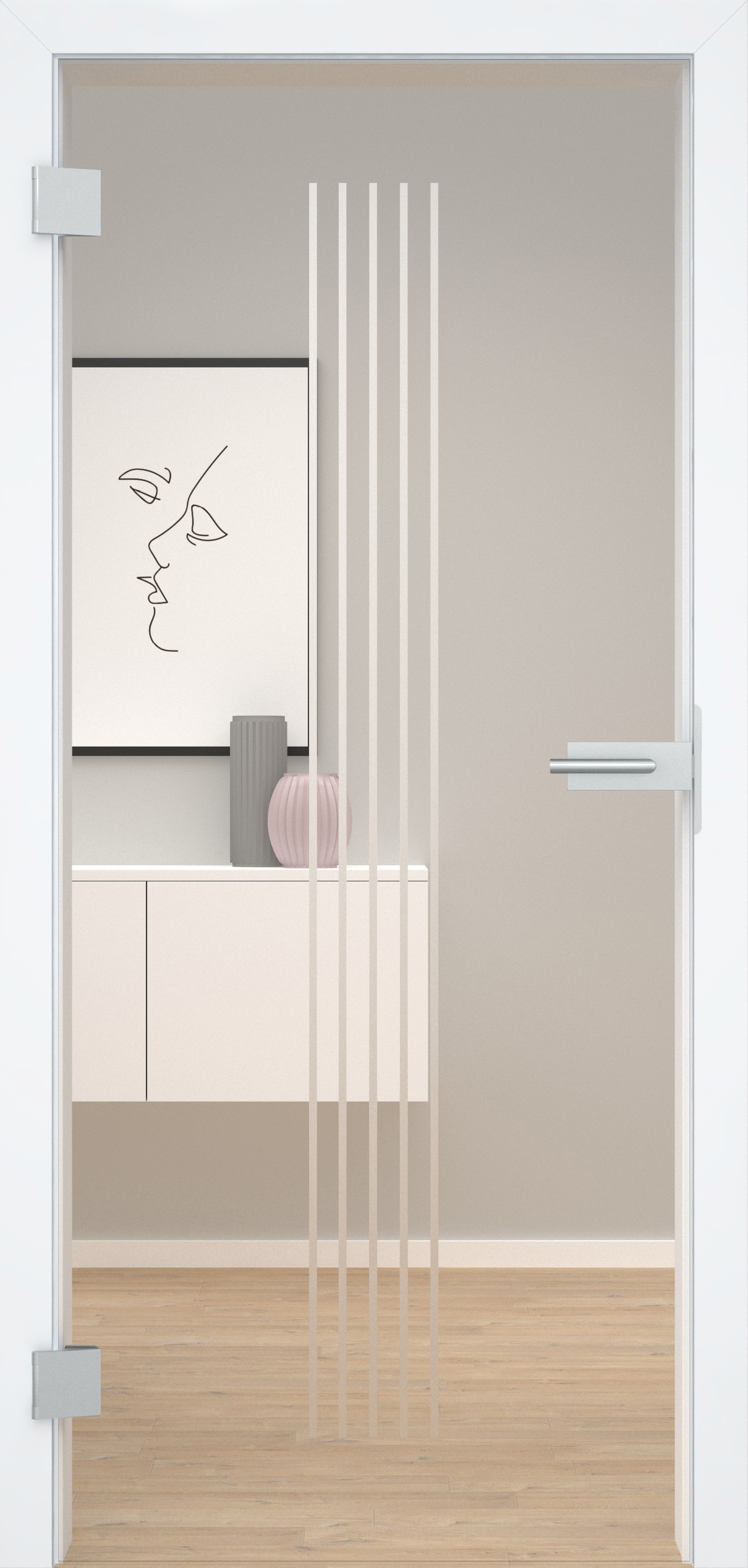 Gerade Linien. Erleben Sie eine neue Dimension der Eleganz mit unserer exklusiven Ganzglastür KM 3-N, die durch keramischen Digitaldruck veredelt wurde. Diese Tür vereint stilvolle Transparenz mit subtiler Raffinesse und setzt so einen zeitgemäßen Akzent in Ihrem Raum. Die großzügige Glasfläche sorgt für einen offenen und lichtdurchfluteten Raum, während die fünf schmalen, senkrechten Linien in der Mitte des Türblatts, in edlem Matt gehalten, einen faszinierenden Kontrast schaffen. Dieser dezente matte Effekt verleiht der Tür nicht nur eine moderne Ästhetik, sondern sorgt auch für eine elegante Diskretion und gleichzeitig eine geschmackvolle Abgrenzung.
