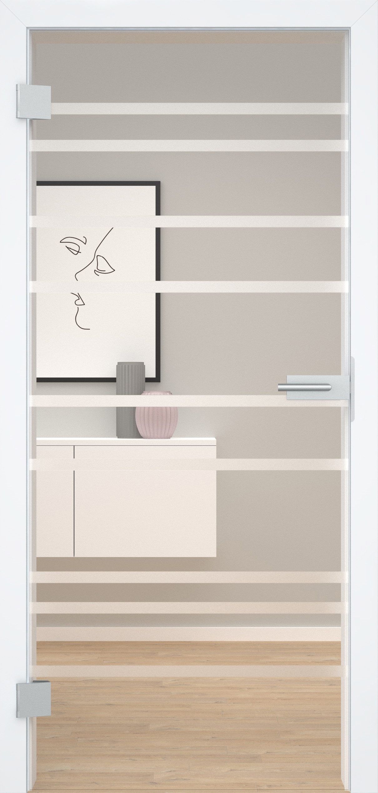 Dynamische Linien: Unsere Ganzglastür Sandmotiv SA 89-N bietet eine hohe Transparenz mit mehreren satinierten und breiten Querstreifen, die durch eine Sandstrahlung entstehen und für deutliche Akzente sorgen. Die Linien sind dabei mit unterschiedlichen Abständen angeordnet, wodurch ein dynamischer Eindruck entsteht. Durch die hohe Transparenz wirken Räume so verbundener und vor allem kleine Räume heller und größer. Bei dem Glas handelt es sich um ein stabiles, 8 mm Einscheibensicherheitsglas (ESG). Eine Nano-Versiegelung sorgt für einen zusätzlichen Schutz der Oberfläche.