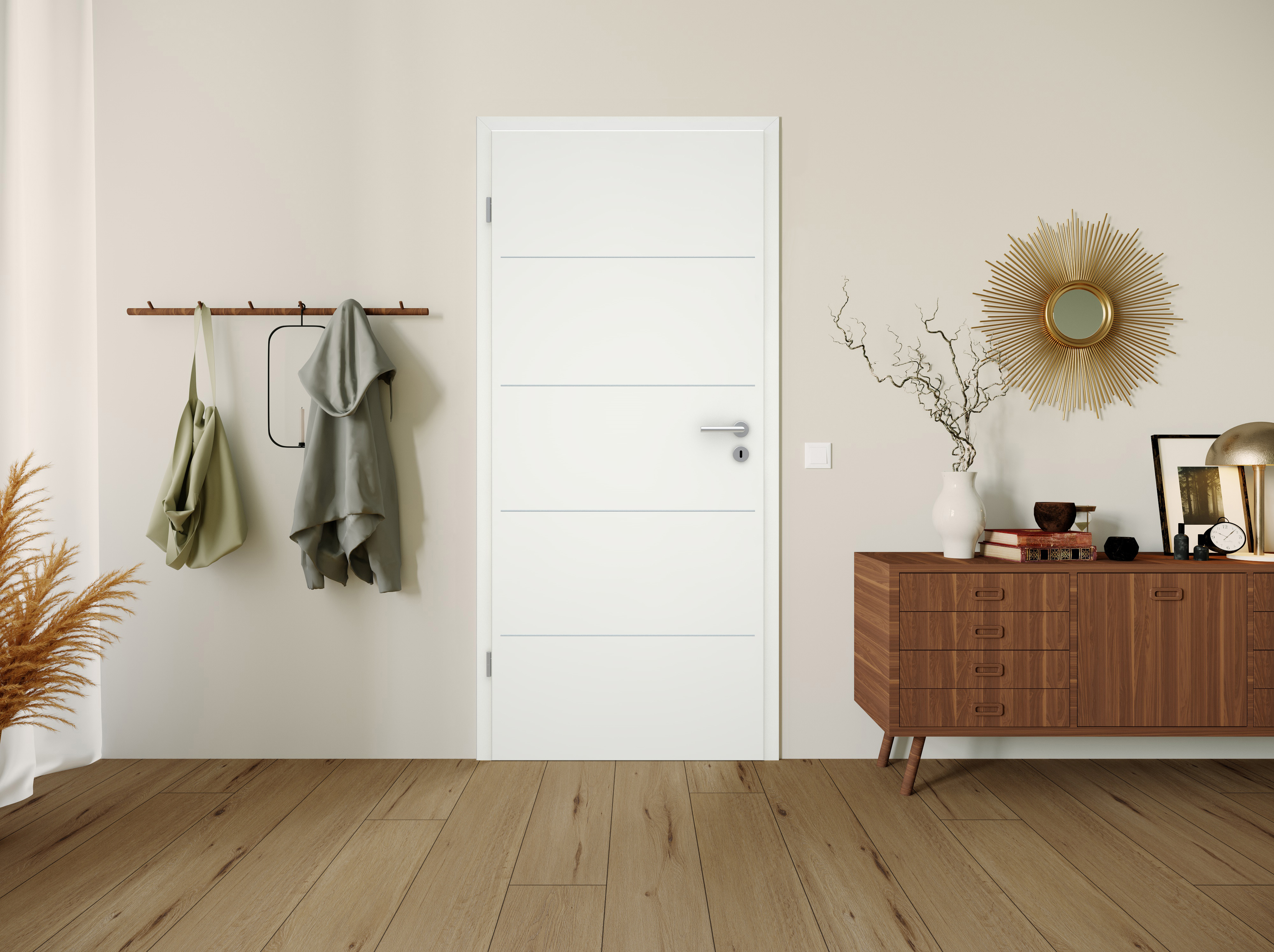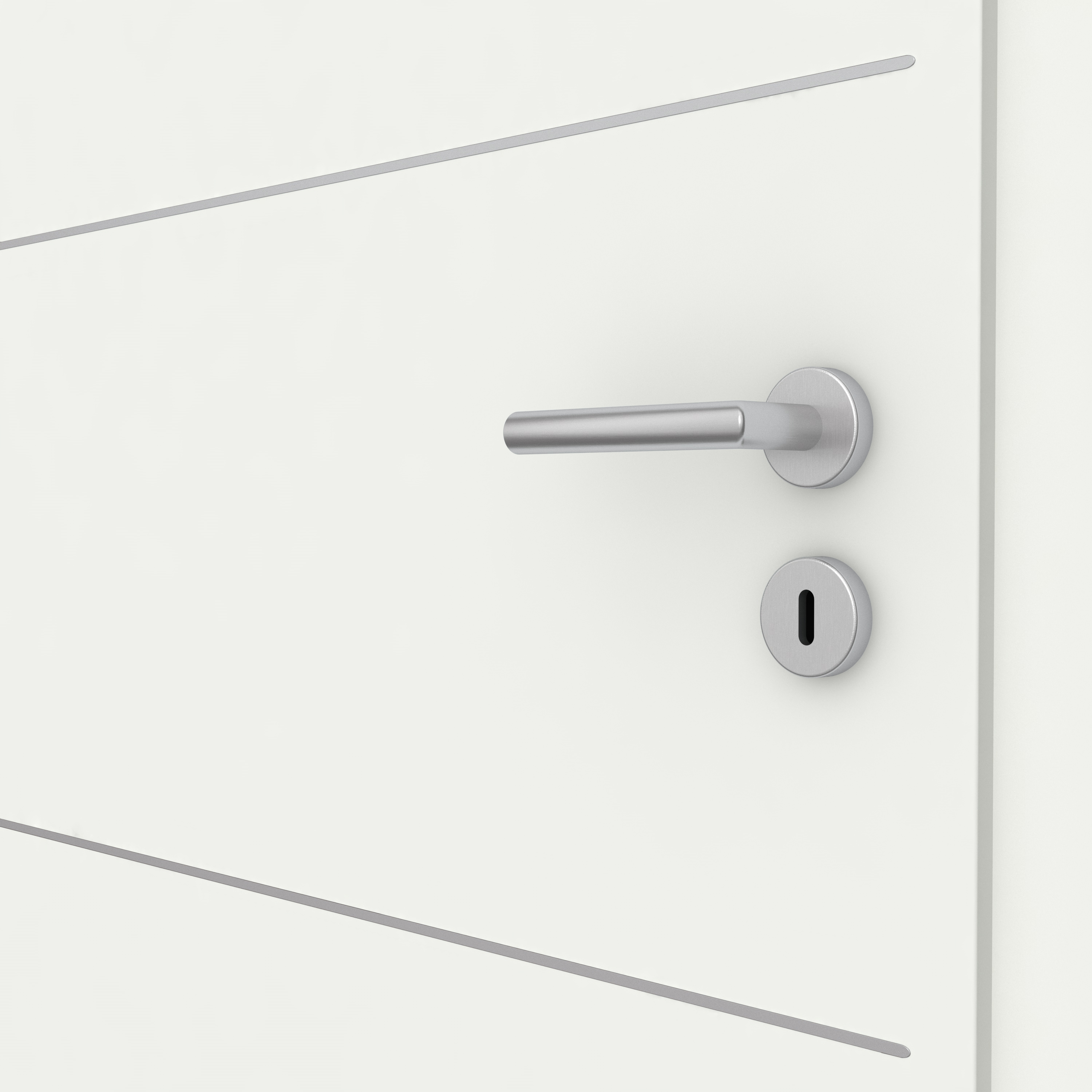 Hochwertige Metallveredelungen in Edelstahloptik oder Schwarz setzen Akzente – besonders bei Türen. Ob horizontal oder vertikal verlaufend, flächenbündig in die Oberfläche eingelassen bieten sie eine Vielzahl von Designmöglichkeiten. So verleihen sie jeder Tür ihren eigenen Charme. Die ansonsten sehr schlichte Tür in Weißlack 1.0 DK erhält durch die Lisenen optische Highlights.