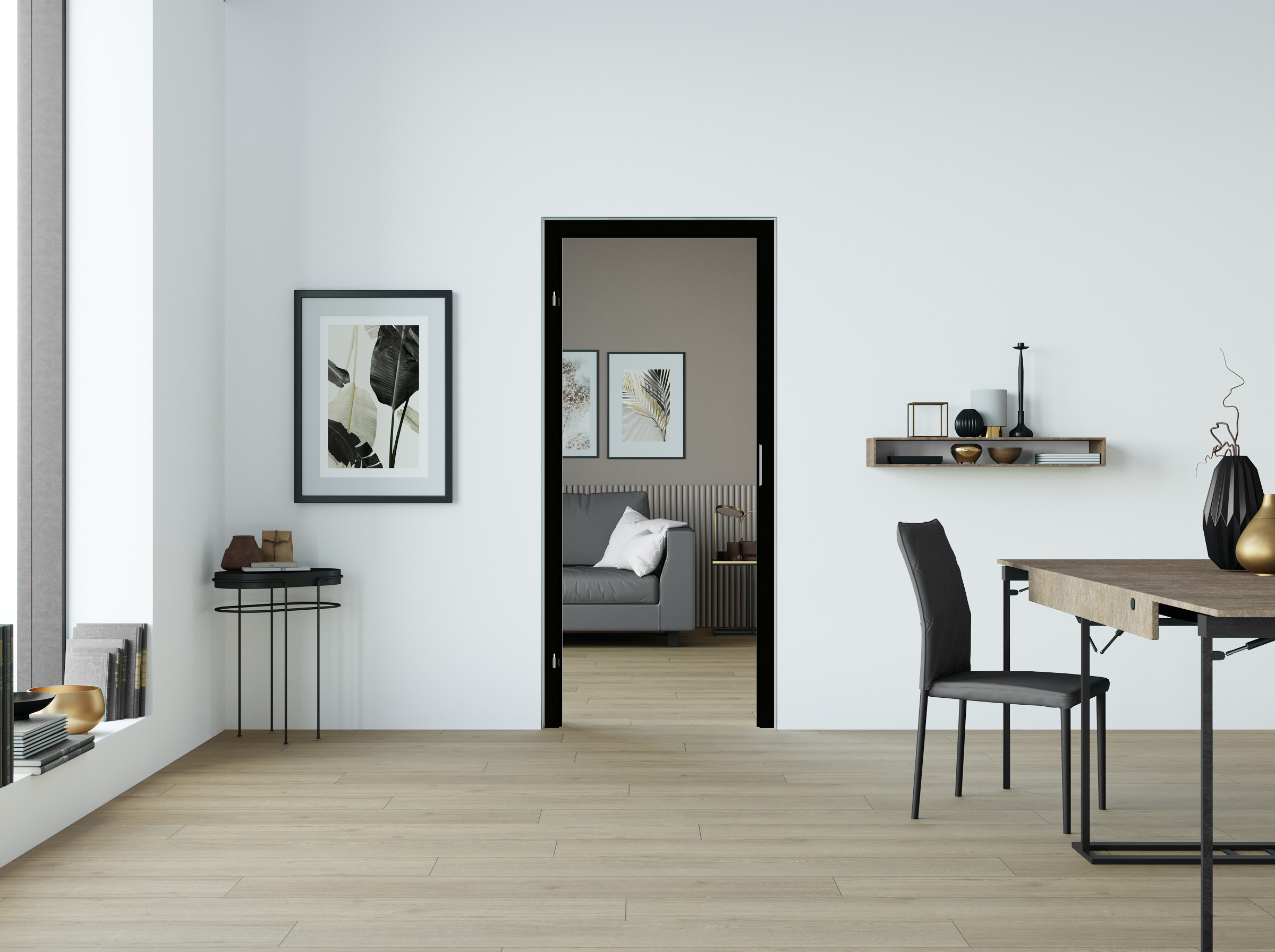 Extramatt und pflegeleicht: Eine innovative Oberflächentechnologie in Kombination mit einem modernen Mattschwarz zeichnet die Zarge CPL Nanoline Mattschwarz aus. Dank einer besonderen Beschichtung entsteht nicht nur eine sehr matte Optik, sondern auch eine sehr robuste Oberfläche, die resistent gegen Fingerabdrücke oder ähnliche Verschmutzungen ist – eben 100% pflegeleicht. Die samtige Haptik lädt zum Anfassen ein und erzeugt eine einzigartige Wohlfühlatmosphäre. Als Durchgangszarge kommt sie dort zum Einsatz, wo keine Tür gewünscht oder technisch nicht möglich ist. Sie sorgt für einen optisch ansprechenden Durchgang sowie für ein offenes Wohngefühl. Auf Bänder, Schließbleche und Dichtungen wird hierbei bewusst verzichtet.